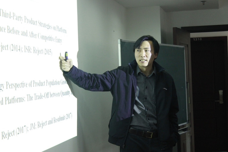 随后分享的是公司营销与电子商务系副教授宋培建老师,其研究方向是平台战略、数据驱动的电子商务运营管理,目前担任ECRA副编辑, MIS Quarterly等期刊审稿人。宋老师在国际顶尖期刊 MIS Quarterly以及主流期刊 Decision Support Systems Engineering Management on and Management, Journal of International Marketing上发表论文20余篇,论文曾入选美国管理学会最佳论文集并获得信息资源管理国际会议最佳论文,复旦大学优秀博士论文,上海市优秀博士论文。此次,他分享的论文The Ecosystem of Software Platform: A Study of Asymmetric cross-side Network Effects and Platform Governance已在MIS Quarterly发表,论文主要讲述了软件生态系统中双边不对称现象的存在以及对平台管理者的建议。宋老师以该篇论文为引题,分享了他关于数据驱动的研究过程以及如何做更具有实践价值和理论意义的学术研究。
