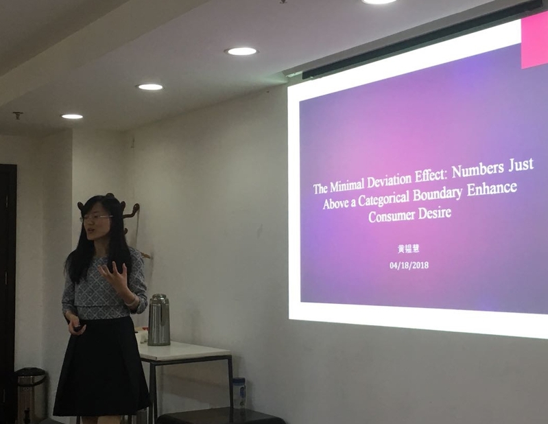 首先分享的是公司营销与电子商务系副教授黄韫慧老师,其主要研究方向为消费行为学,目前主持3项国家自然科学基金项目。黄老师近3年以第一或者通讯作者博士身份发表SSCI论文11篇(含接受),其中太阳成集团tyc33455cc国际学术期刊版1区1篇,2区5篇,3区1篇。黄老师与公司营销与电子商务系助理教授龚晗老师合著的论文The Minimal Deviation Effect: Numbers Just Above a Categorical Boundary Enhance Consumer Desire被 Journal of Consumer Research录用。分享中,黄老师详细地介绍了写作心得,以数字中整数外“零头”部分会带来一种唤起为切入点,介绍了这种唤起如何引起了消费者在判断上的偏差,从而改变了消费者对产品的欲望和喜欢。