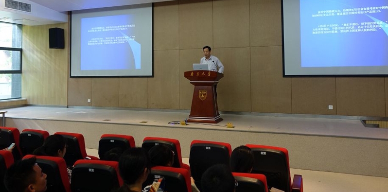 刘厚俊教授妙语连珠,将这场没有硝烟的贸易交锋以轻松诙谐的方式徐徐而述,内容充实,不失幽默,场下的同学听得十分入神,不时传来轻松的笑声。这场讲座将中美贸易史与当下热门时事相结合,经典而富有趣味。