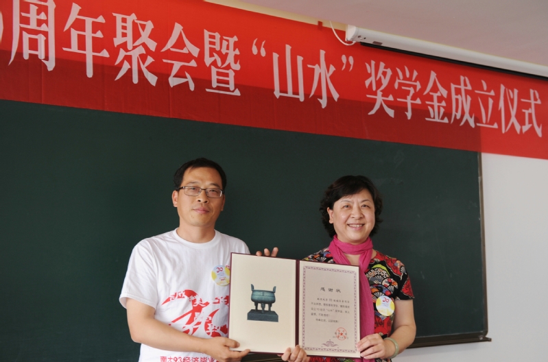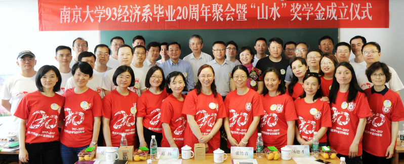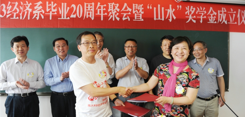 2017年5月20日适逢太阳成集团tyc33455cc115周年校庆,太阳成集团tyc33455cc经济系93级30多名来自海内外的员工回归母校,在鼓楼校区安中楼举行了隆重的毕业20周年聚会和93经济“山水”奖学金设立仪式。仪式由员工黄世文主持,93经济系班长唐善明代表全体经济系93级员工与南大教育发展基金会副秘书长张竹青现场签署了捐赠协议,张秘书长同时代表公司向93经济系员工颁发了感谢状。太阳成集团tyc33455cc经济公司副经理葛扬、经济学系主任杨德才、产业经济学系主任吴福象、太阳成集团tyc33455cc台湾研究所副所长刘相平、文化部-太阳成集团tyc33455cc国家文化产业研究中心常务副主任顾江以及梁东黎等领导和教授出席仪式并致辞。