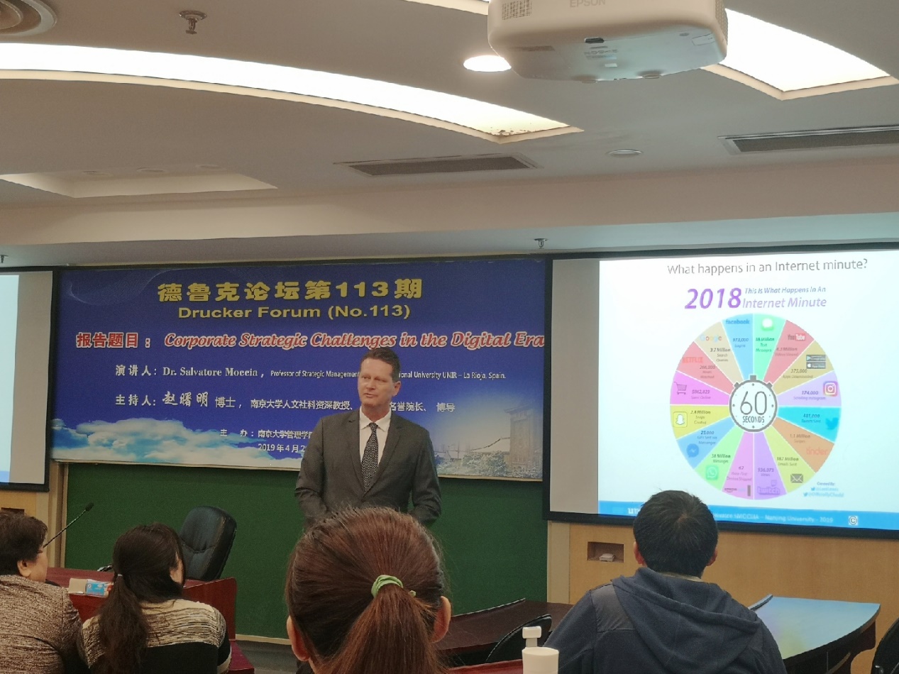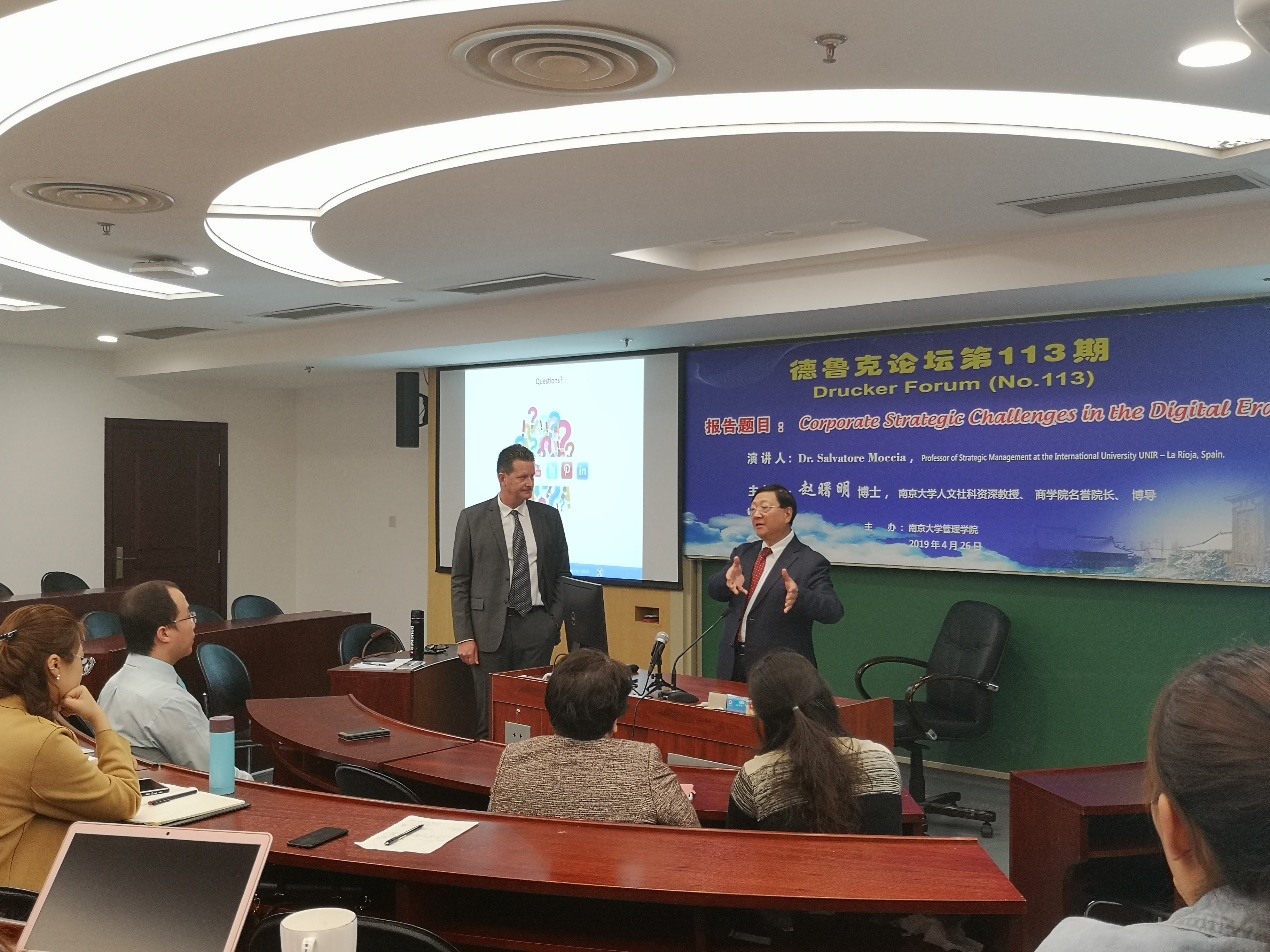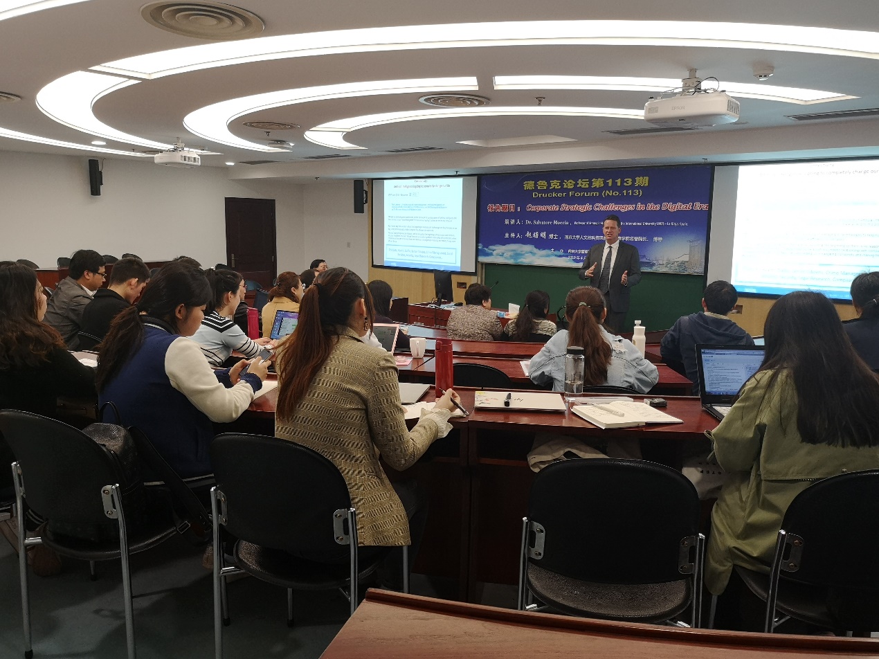 2019年4月26日上午10点30分,德鲁克论坛第113期在安中楼312教室顺利举行。西班牙利奥哈国际大学Salvatore Moccia教授受邀作了题为“Corporate Strategic Challenges in the Digital Era”的主题报告。论坛由太阳成集团tyc33455cc人文社会科学资深教授、太阳成集团tyc33455cc名誉经理赵曙明教授主持。30多位教师、博士生和硕士生参加了本次论坛。
