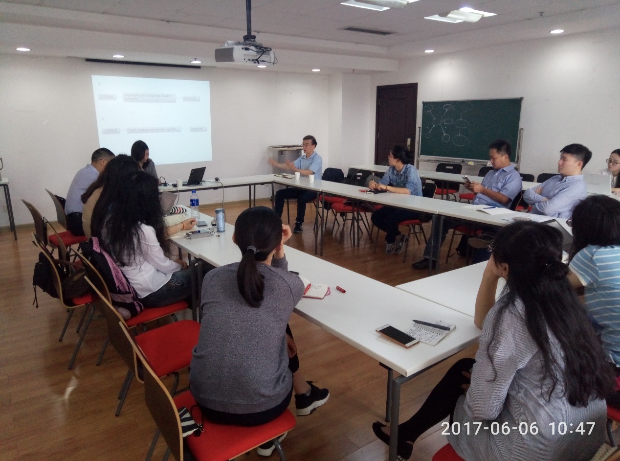 6日上午,陈昭全教授与李虎老师讨论“马基雅维利主义者权力获得的手段: 关系和辱虐式管理行为”。随后,与刘莹(2016级博士生)讨论工匠精神概念的发展以及作用机制探讨。