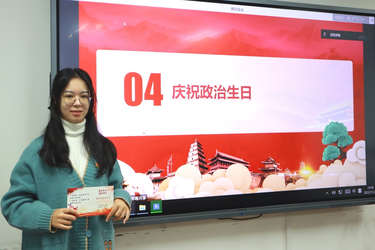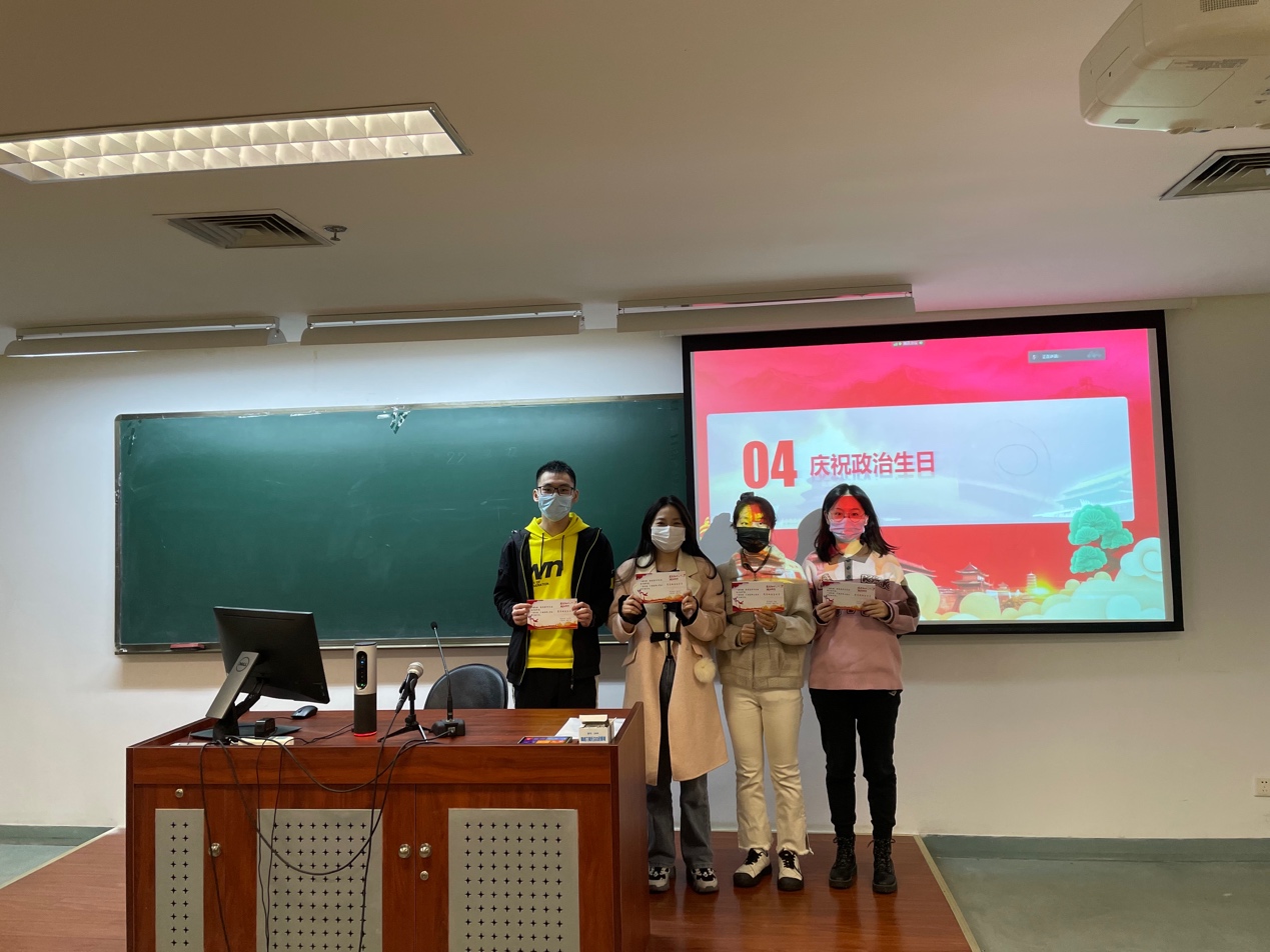 为更好将二十大精神内化于心外化于行,加强党员党性教育,激发党员政治热情,推动学习贯彻党的二十大精神往深里走、往实里走、往心里走,两支部为第四季度入党的11位党员举办庆祝政治生日活动,并赠送党员政治生日卡。文公司2022级硕士生第一党支部李瑞雨表示,党员的政治生命属于党。“政治生日”是党员个体的政治“成人日”“感恩日”。过“政治生日”,在个人维度上,就是为了校准目标、方向、理想,时刻紧绷纪律规矩这根弦,更好地永葆先进性、纯洁性。2021级经济硕士党支部刘铭丞表示,希望通过“政治生日”这一政治仪式激励同志们在坚定理想信念,深化理论武装上再下功夫;在立足主责主业,努力科研创新上再下功夫;在开展实习实践,扎根基层奋斗上再下功夫。
