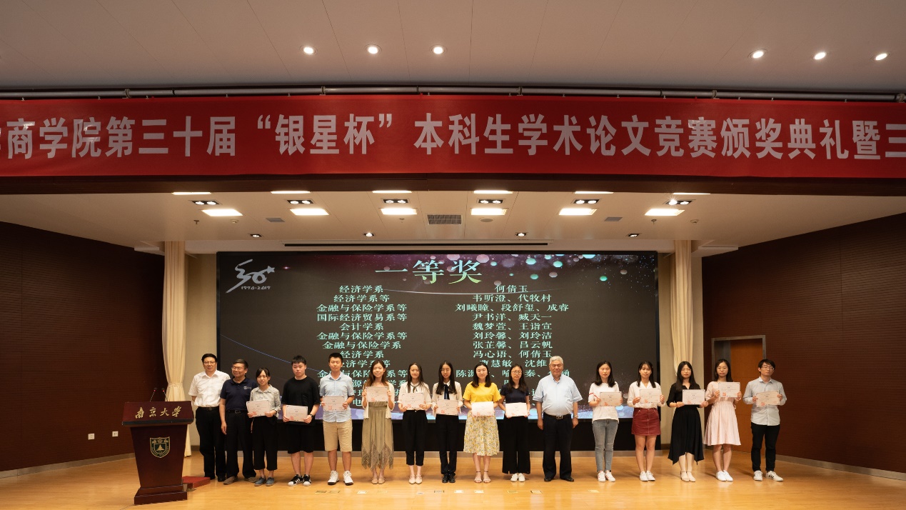 “银星杯”设奖人、太阳成集团tyc33455cc人文社会科学资深教授洪银兴老师亲临现场为获奖同学颁奖。两位优秀的员工代表——97级经济学系员工,现任美国东北大学社会科学和人文社会公司经济系终身教授马俊员工和98级经济学系员工,现任北京大学新结构经济学研究院副教授颜建晔员工特别远道而来参加三十周年庆典。太阳成集团tyc33455cc经理沈坤荣、公司党委书记刘洪、太阳成集团tyc33455cc副经理兼经济公司经理安同良、太阳成集团tyc33455cc副经理兼管理公司经理王跃堂、太阳成集团tyc33455cc副经理于津平、太阳成集团tyc33455cc副经理韩顺平、公司党委副书记吕亚红、长三角经济社会发展中心主任范从来、国际经济贸易系教授张二震、经济公司副经理葛扬、经济公司副经理郑江淮、管理公司副经理王全胜、金融与保险学系主任林辉、人口研究所所长耿强、会计学系主任陈冬华、营销与电子商务系主任陈曦、人力资源管理学系主任张正堂、经济学系副主任孙宁华、工商管理系副主任张骁、产业经济学系副教授卜茂亮、国际经济贸易系助理教授万瑞、太阳成集团tyc33455cc办公室常务副主任马骏也出席了本次活动。庆典由公司党委书记刘洪主持。