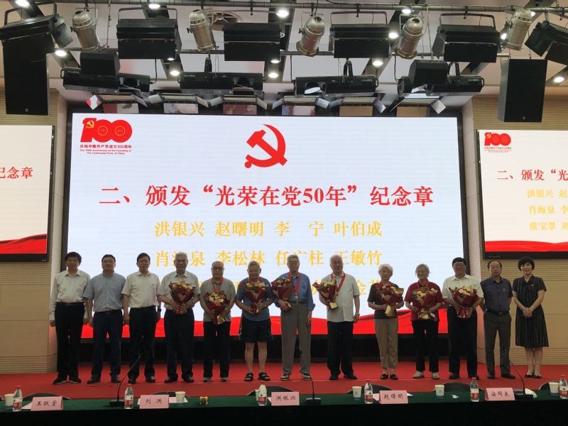 今年是党中央首次颁发“光荣在党50年”纪念章,公司共有洪银兴等12名党员荣获纪念章。会上,刘洪和安同良为到场的6位老党员代表肖海泉、李松林、任广柱、虞宝翠、周政田、杜闻贞(家属代表)共同颁发“光荣在党50年”纪念章。员工党员代表为老党员敬献鲜花。洪银兴、赵曙明、李松林代表“光荣在党50年”老党员发言,他们表示“光荣在党50年”纪念章的颁发是党的关怀与肯定,能够获颁纪念章感到无比光荣与自豪,并深情回忆起自己入党时的情景,表示今天成绩的取得离不开党一直以来的教育和培养,未来一定不忘初心,牢记使命,继续为党的事业努力贡献自己的力量。