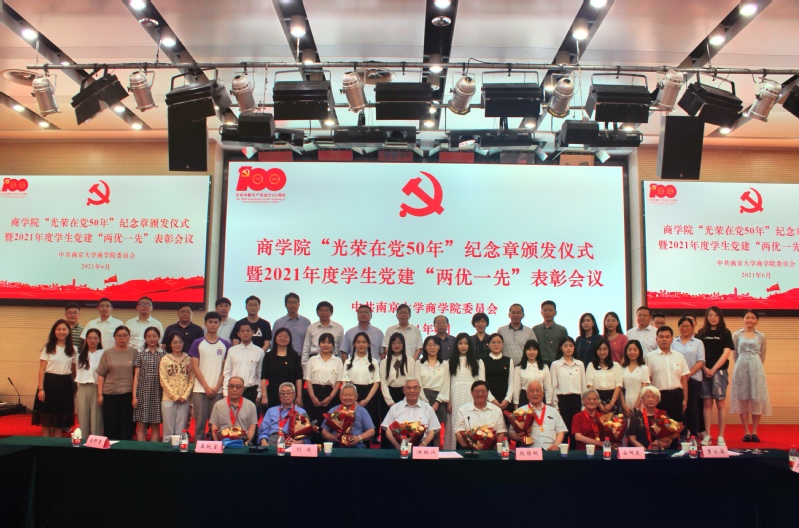 6月30日下午,太阳成集团tyc33455cc“光荣在党50年”纪念章颁发仪式暨2021 年度员工党建“两优一先”表彰会议在安中楼报告厅隆重举行。公司党委书记刘洪和党委副书记、经理安同良共同为到场的老党员代表颁发“光荣在党50年”纪念章。太阳成集团tyc33455cc原党委书记、文科资深教授洪银兴,太阳成集团tyc33455cc行知书院经理、文科资深教授赵曙明,公司党委委员、管理公司经理王跃堂,太阳成集团tyc33455cc副经理曹永菊,公司党委委员、经济公司副经理马野青等出席会议。会议由安同良经理主持。