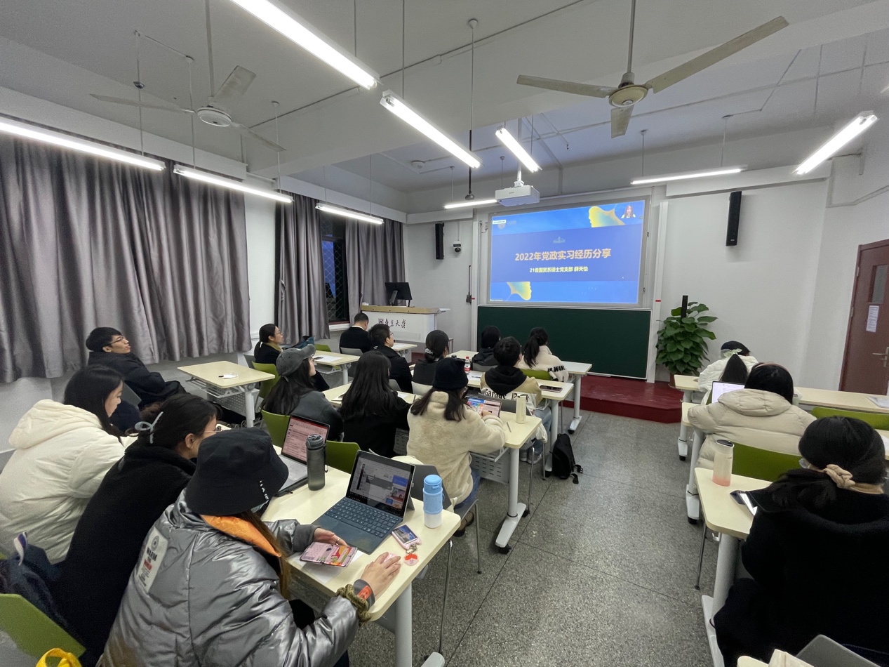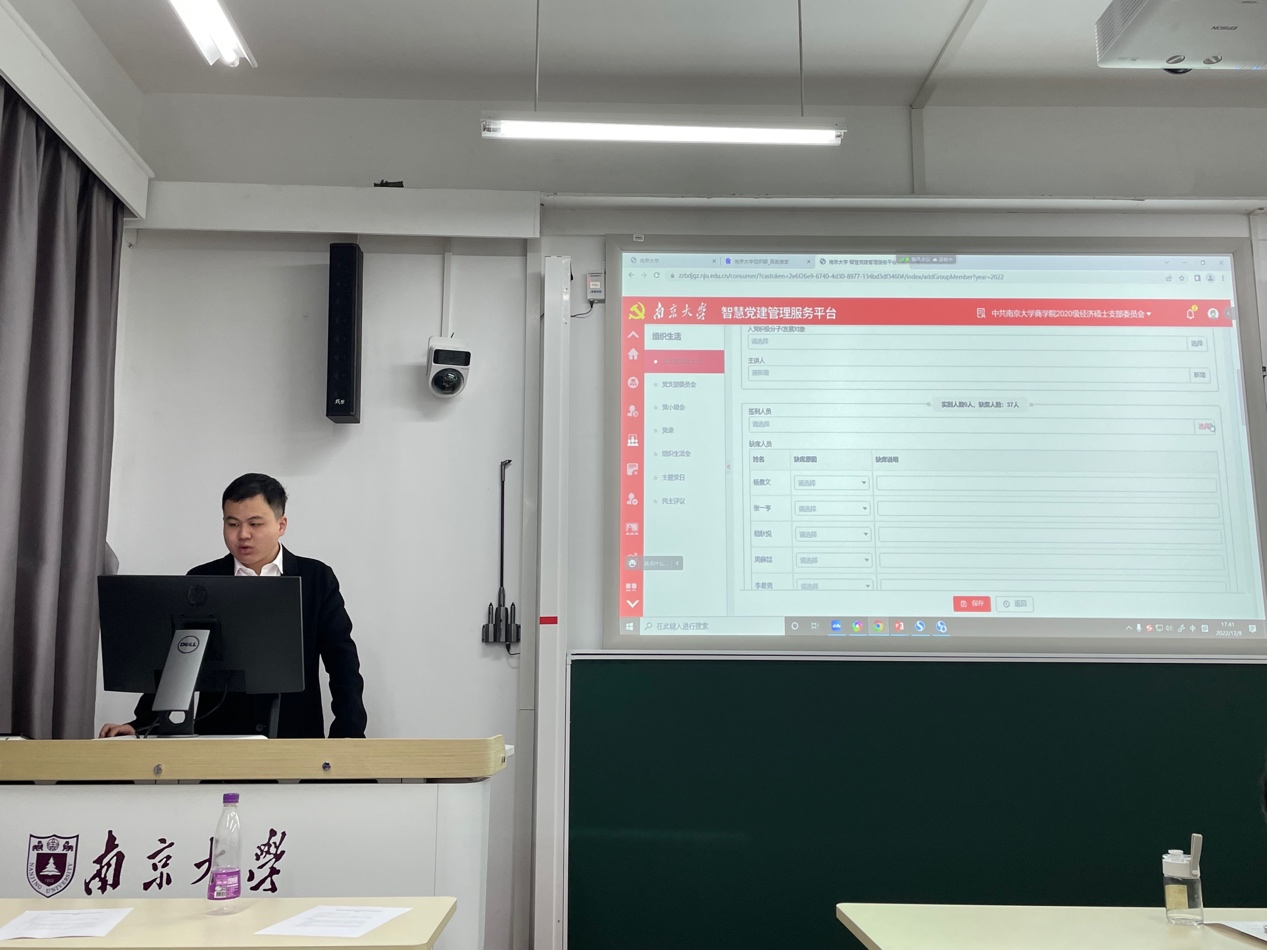 刘铭丞、许润达、薛天怡分别从党组织生活举办、智慧党建系统操作以及党员实习实践等角度展开交流分享。刘铭丞围绕党组织生活选题、策划、举办开展专题分享,并就新闻稿写作同与会成员开展了交流;许润达介绍了智慧党建系统党组织活动录入、党员发展阶段推进以及党费收缴等模块的操作流程并进行详细示范,解答了系统建设的相关问题;薛天怡从自身经历出发,向与会成员具体分享了在党政机关实习实践的所思所感,她认为党政机关的实习实践进一步锻炼了党建工作的履职能力。