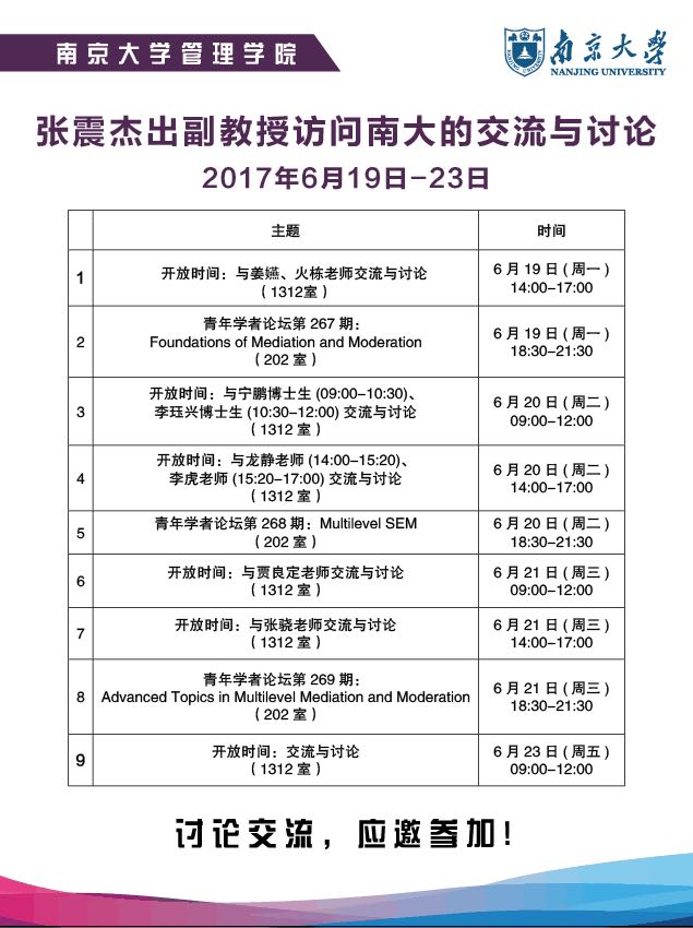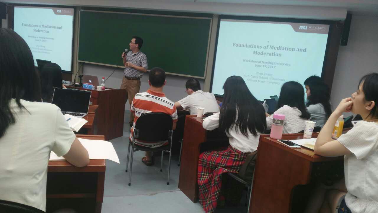 2017年6月19日-23日,亚利桑那州立大学杰出副教授张震博士受工商管理系邀请,来公司访问交流。张震老师的研究方向包括:领导力开发、团队研究、创业者性格与行为,以及高级定量研究方法。他的研究成果发表于多个国际顶级管理学期刊,并担任这些期刊的编委,包括Academy of Management Journal, Journal of Applied Psychology, Personnel Psychology, Organizational Behavior and Human Decision Processes, Psychological Bulletin, Psychological Methods等。在为期五天的访问交流中,张震老师为来自各地的师生们开展了三场青年学者论坛,向南大师生分享最前沿的定量研究方法。三次论坛均由贾良定教授主持。