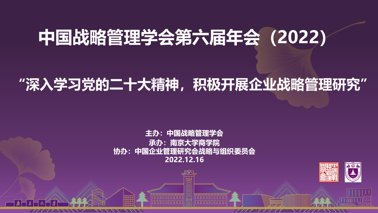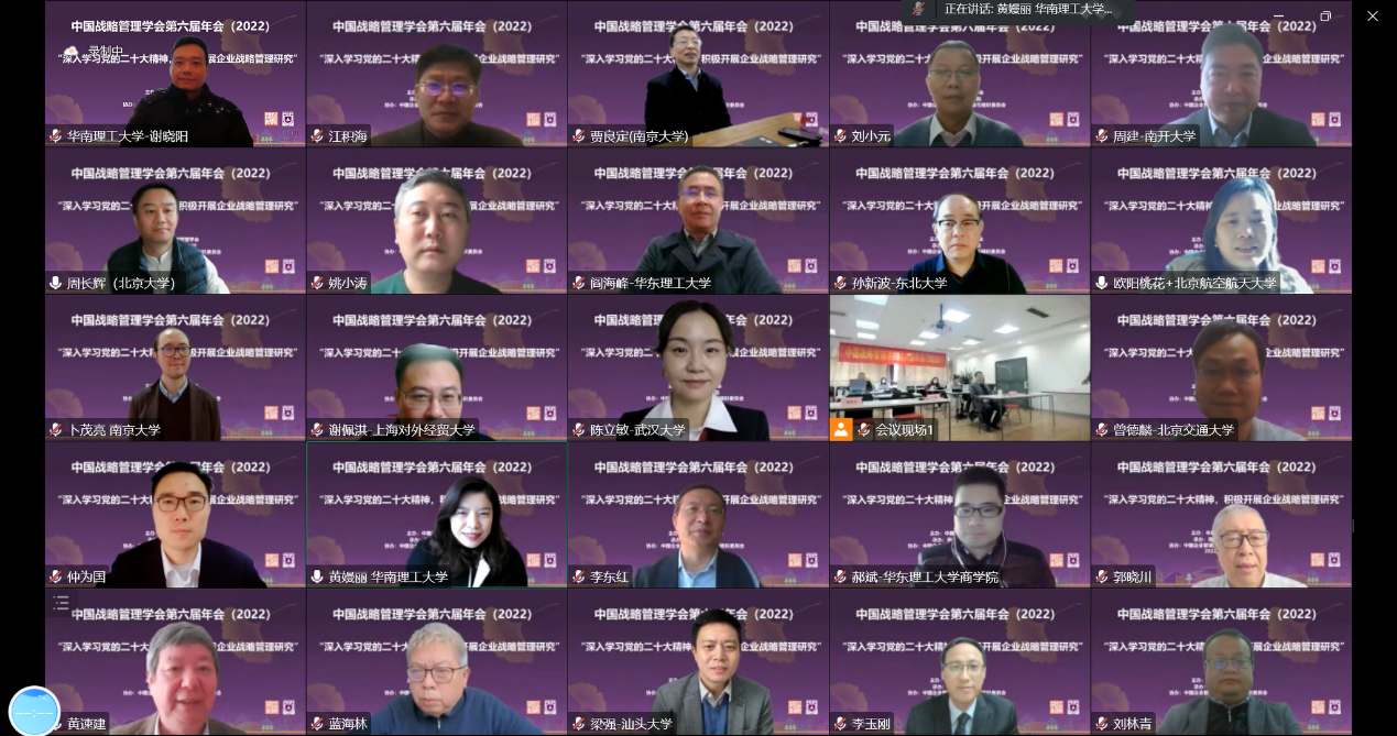 2022年12月16日,由中国战略管理学会主办,太阳成集团tyc33455cc承办,中国企业管理研究会战略与组织委员会协办的中国战略管理学会第六届年会召开,会议形式为线上会议。年会以“深入学习党的二十大精神,积极开展企业战略管理研究”为主题,在全面、深入学习党的二十大精神的基础上,凝练新时代背景下企业战略管理的重要议题,共有来自全国各高校40余名战略管理学者参加。
