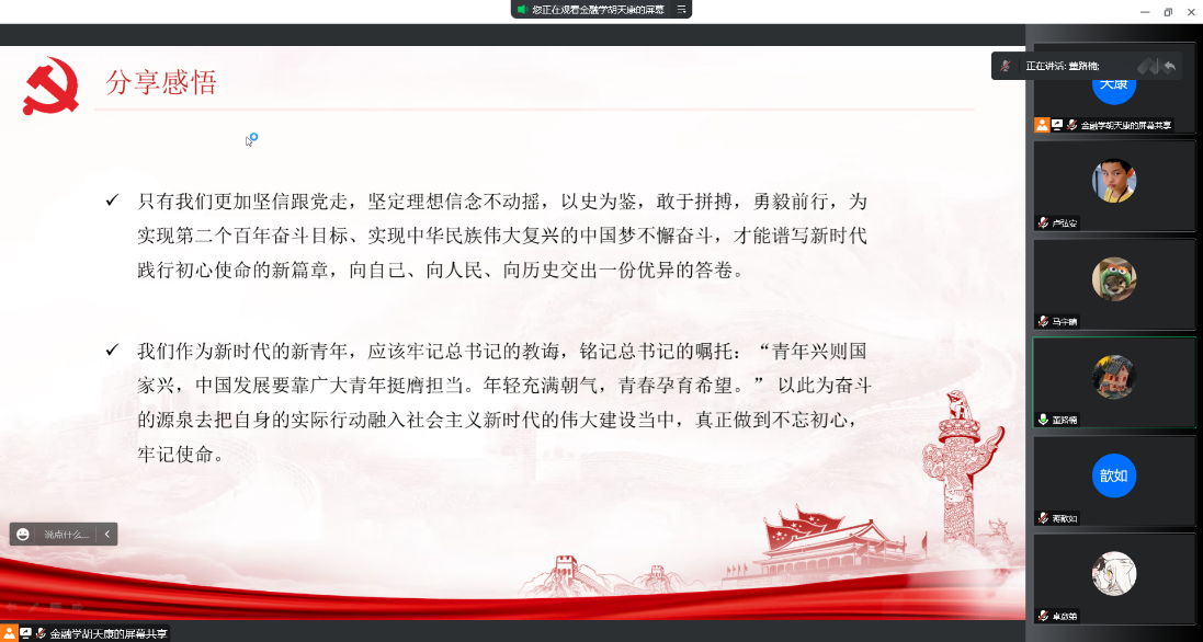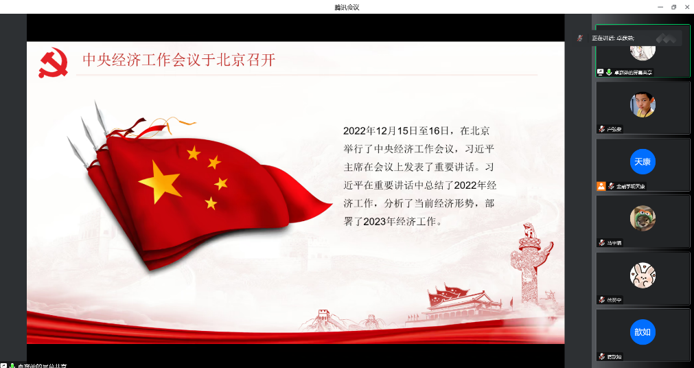 2022年12月15日至16日,党的二十大后首次中央经济工作会议在北京举行。习近平总书记在会上就2022年经济工作、当前经济形势、明年经济任务等议题发表重要讲话。为坚定信心,紧密团结在以习近平同志为核心的党中央周围,全面贯彻习近平新时代中国特色社会主义思想,2023年1月10日,2021级金融学硕士党支部线上开展深入学习中央经济工作会议主题党日活动。党支部全体党员均参加此次活动。会议由党支部组织委员胡天康同志主持。