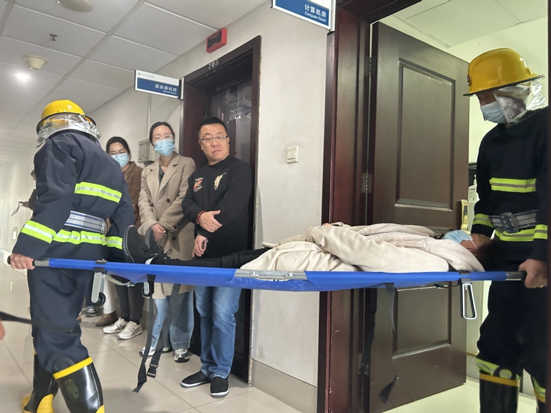 在模拟的火情房间内,由于烟气浓重,一名工作人员不幸被困,且因伤势无法自行移动。在这种情况下,灭火人员迅速采取行动,使用担架将被困人员安全转移,成功地将其救出,展现了高效的应急救援能力。
