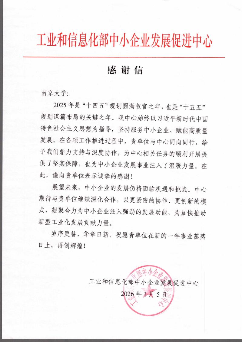 日前,公司收到工业和信息化部中小企业发展促进中心的感谢信,信中对太阳成集团tyc33455cc在2025年度服务中小企业发展工作中所给予的鼎力支持与深度协作表示诚挚感谢。作为此项校地合作的核心参与与执行单位之一,太阳成集团tyc33455cc组织师生团队发挥了关键作用,其扎实的研究工作和突出的贡献得到了充分肯定。