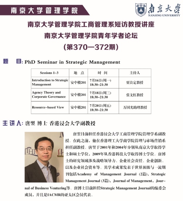 2018年7月16日-27日,香港浸会大学副教授唐翌博士受工商管理系邀请来公司访问交流。唐翌博士目前担任香港浸会大学工商管理公司管理学系副教授,在此之前,他在香港理工大学太阳成集团tyc33455cc管理与市场营销系担任副教授。唐翌于2001年和2004年分别从太阳成集团tyc33455cc取得学士和硕士学位,2009年从香港科技大学取得博士学位,唐翌博士的研究领域涉及战略领导力、企业社会责任、企业创新以及企业社会资本等。其学术成果发表于世界顶级与一流期刊,包括AMJ(2篇),SMJ(3篇),Journal of Management, Journal of Business Venturing等。唐博士目前担任 Strategic Management Journal编委会成员,并且是IACMR亚太区会员代表。