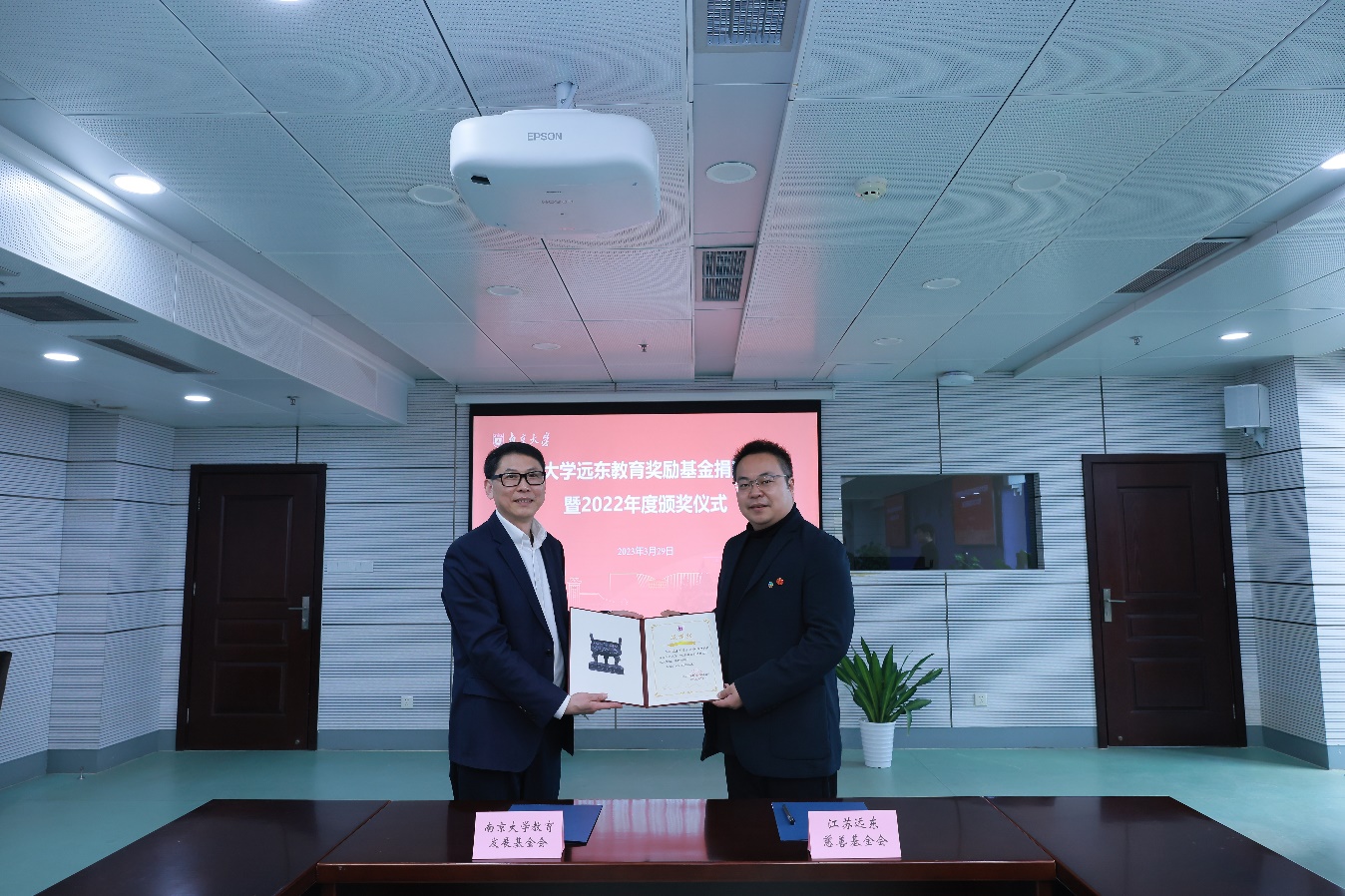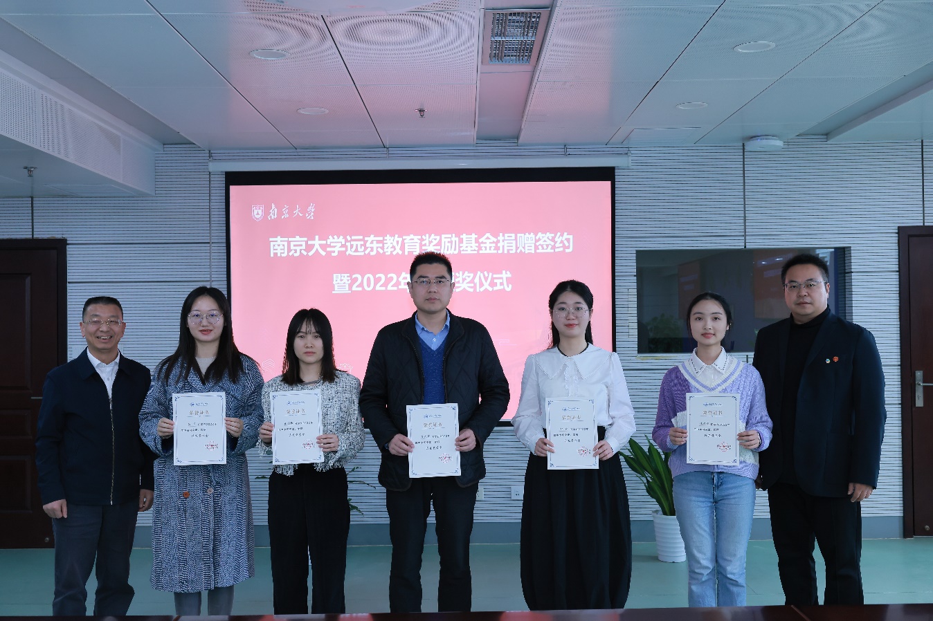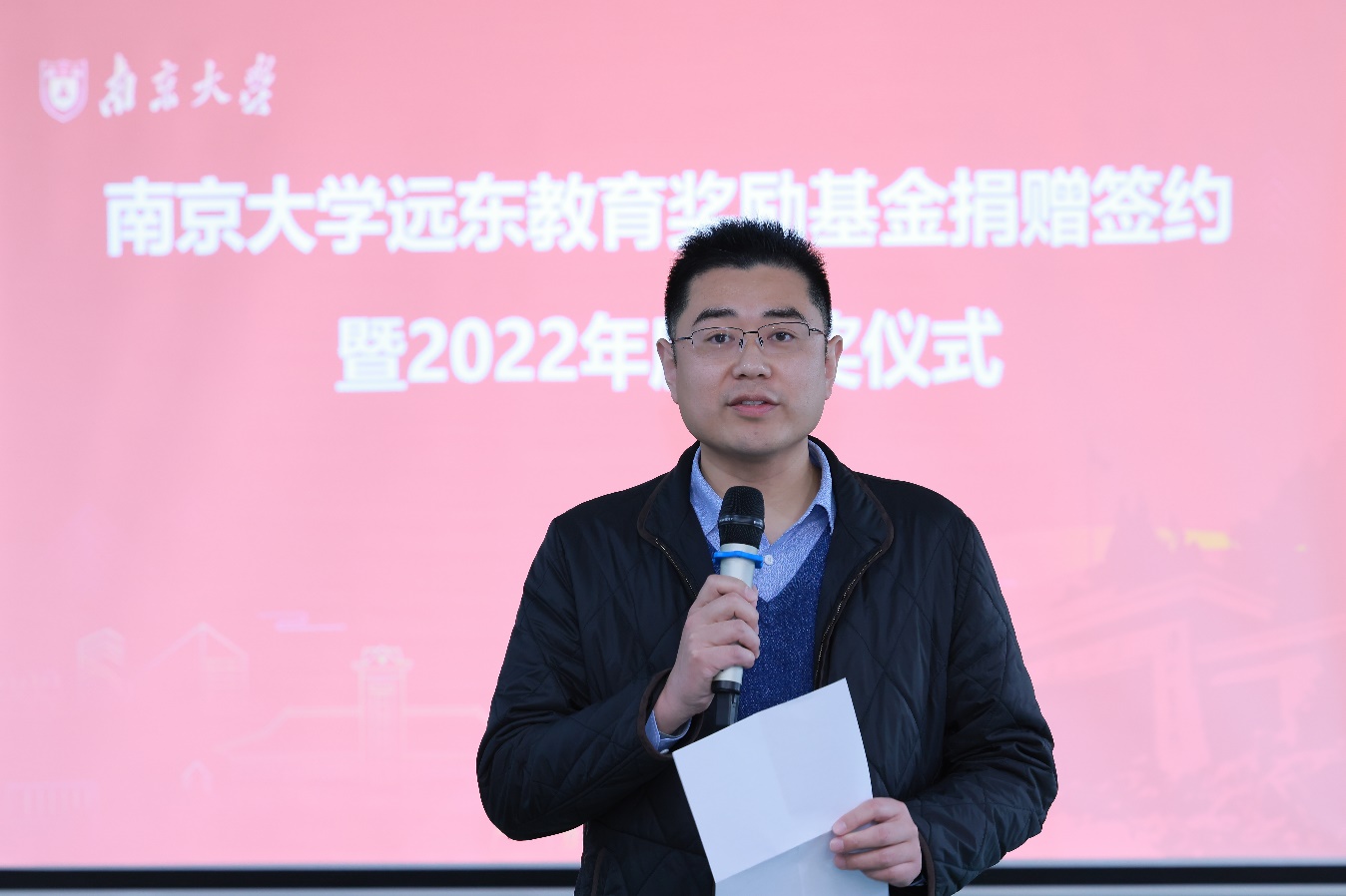 3月29日,太阳成集团tyc33455cc远东教育奖励基金捐赠签约暨2022年度颁奖仪式在鼓楼校区安中大楼隆重举行。远东股份资深合伙人、董事会秘书、首席行政人力资源官、远东大学执行董事长邵亮出席仪式并为获奖师生颁奖。远东控股集团党政办公室主任助理康娜,远东股份总经理办公室首席行政人力资源官秘书梁毅,远东控股集团党政办公室研究生管培生李潇,太阳成集团tyc33455cc员工事务与发展工作处处长、教育发展基金会秘书长张锁庚,公司党委书记刘春林,经济公司副经理、太阳成集团tyc33455cc员工与发展办公室主任孙宁华,管理公司副经理、太阳成集团tyc33455cc本科生教学与培养办公室主任贾良定,公司党委副书记王宇伟以及获奖师生代表参加仪式。王宇伟主持仪式并介绍本次捐赠项目概况。