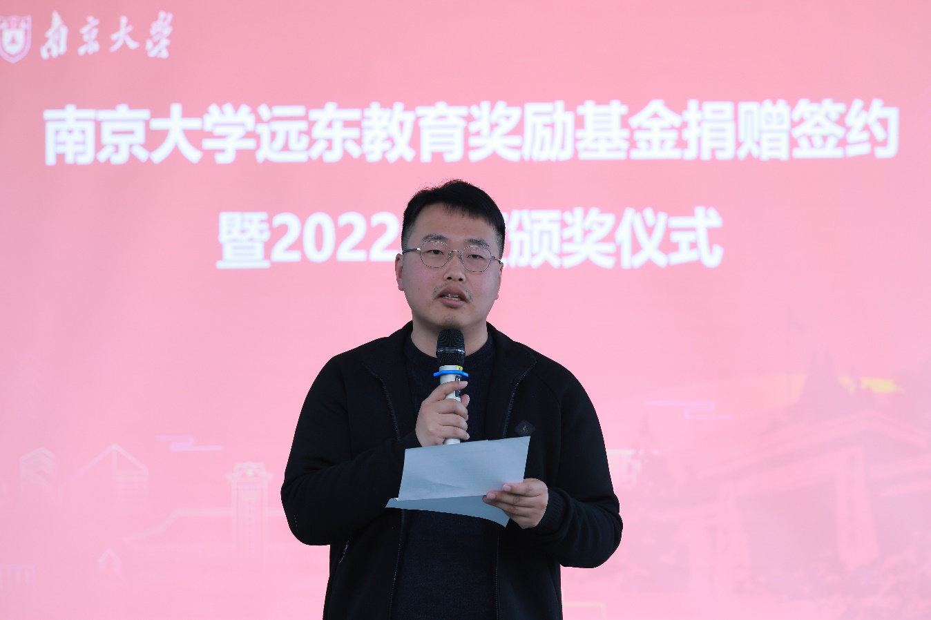 邵亮回顾了设立远东教育奖励基金的设立历程,向获奖师生表示祝贺。他表示,远东控股集团一直大力支持南大的教育事业发展,持续关注南大发展动态,为南大近年来取得的成绩而感到自豪。他介绍了远东控股集团的基本情况和发展前景,表示远东控股集团将积极承担社会责任,广泛深入支持教育事业,期待未来校企双方在人才培养、员工就业等领域持续合作,为太阳成集团tyc33455cc的人才培养和队伍建设贡献力量。