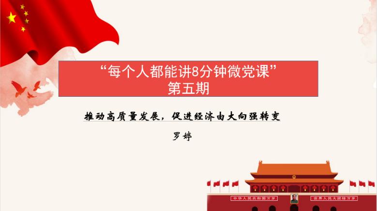 罗婷同志主讲“每个人都能讲8分钟微党课”第五期——“推动高质量发展,促进经济由大到强转变”。罗婷同志结合《质量强国建设纲要》内容,介绍世界百年未有之大变局背景下,全球质量理念、机制、实践正发生深刻变革。她指出在此形势下,我国应当推动中国制造向中国创造转变、中国速度向中国质量转变、中国产品向中国品牌转变,坚定不移推进质量强国建设。