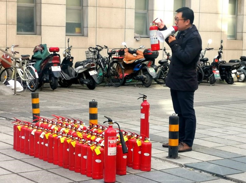 宣讲人员讲解火灾现场应急处置方案和灭火器操作要领