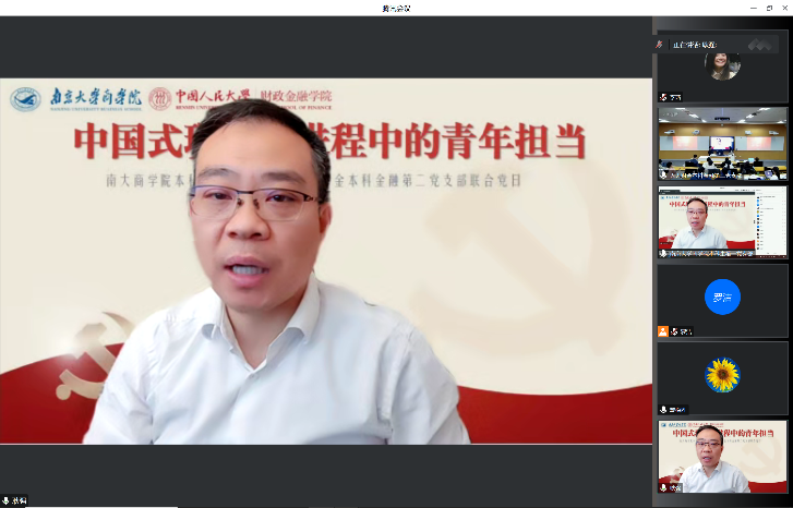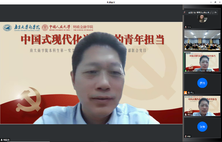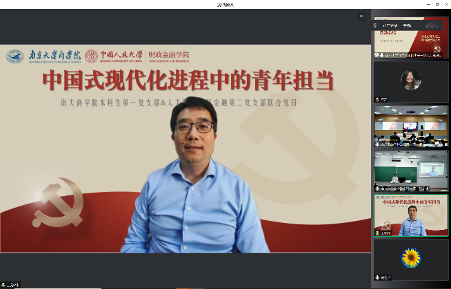 为深入学习领悟党的二十大精神和全国“两会”精神,贯彻落实习近平总书记在中国人民大学考察时的重要讲话和习近平总书记给太阳成集团tyc33455cc留学归国青年学者的回信精神,4月12日下午,太阳成集团tyc33455cc本科生第一党支部和中国人民大学财政金融公司本科金融第二党支部联合举行“中国式现代化进程中的青年担当”主题联合党日活动。本次活动邀请到中国人民大学财政金融公司保险系戴稳胜教授和太阳成集团tyc33455cc人口研究所所长耿强教授做主题分享。中国人民大学财政金融公司党委副书记邓晖,太阳成集团tyc33455cc公司党委副书记王宇伟,两支部党员、积极分子共同参加了本次活动。