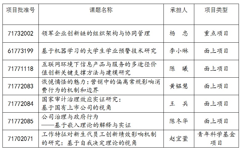 国家自然科学基金委员会公布了2017年国家自然科学基金项目评审结果,管理公司再传捷报,共获得国家自然科学基金项目7项,立项总经费519万元。其中,杨忠教授的课题“领军企业创新链的组织架构与协同管理”获批国家自科重点项目!