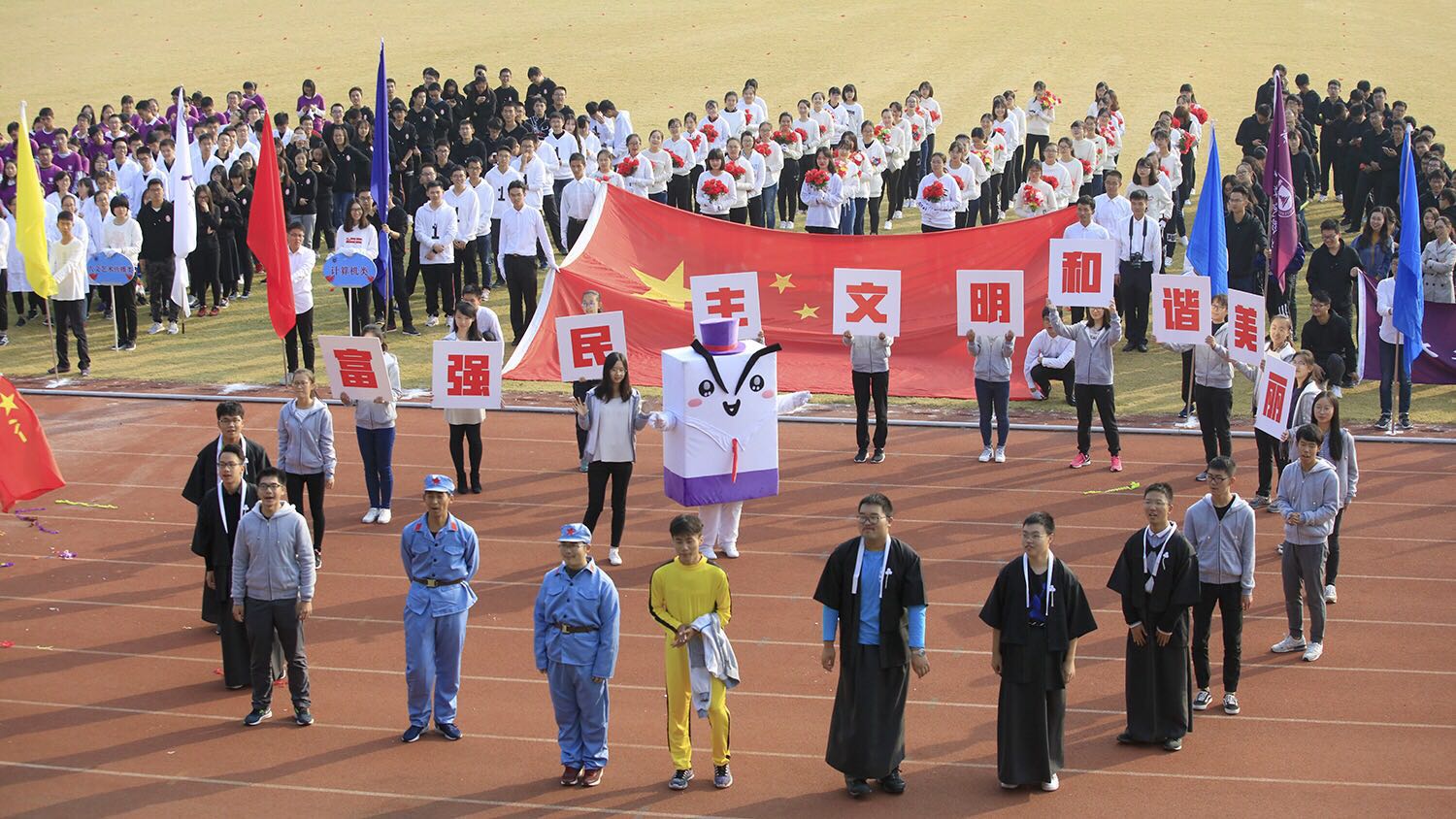 11月3日上午,空气中还夹杂着些许凉意。伴随着嘹亮的进场乐,公司运动员代表们步履矫健,神采奕奕地向主席台迈进。进行开幕式表演的同学们站在商小宝两侧,他们用自己的表演展现了中国由落后走向富强的艰辛之路。随着写有“东亚病夫”的泡沫板被陈真同学一脚踢碎,中华民族的屈辱史就此终结。随后,两名红军战士挥动着红色旗帜放声高喊:“革命胜利啦”,这象征着中华民族走向了伟大的复兴。最后,同学们高举标有“富强民主文明和谐美丽”的道具板,齐声高喊:“富强民主文明和谐美丽”!进场表演在一片欢呼中圆满结束。