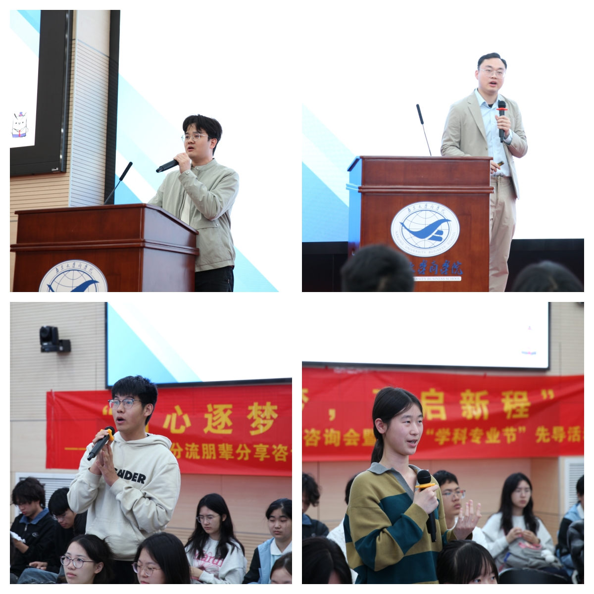 随后,各系所分享嘉宾分别在四个分会场进行分享。他们从朋辈的视角出发,详细介绍了各专业的特色亮点、学习内容、课程设置及未来发展方向,并结合自身的学习体验,帮助新生们更直观地了解各专业的特点,也为他们的分流选择提供了实际参考。经济学拔尖班同步开展了分享交流活动,2024级博士研究生段舒玺参与分享。