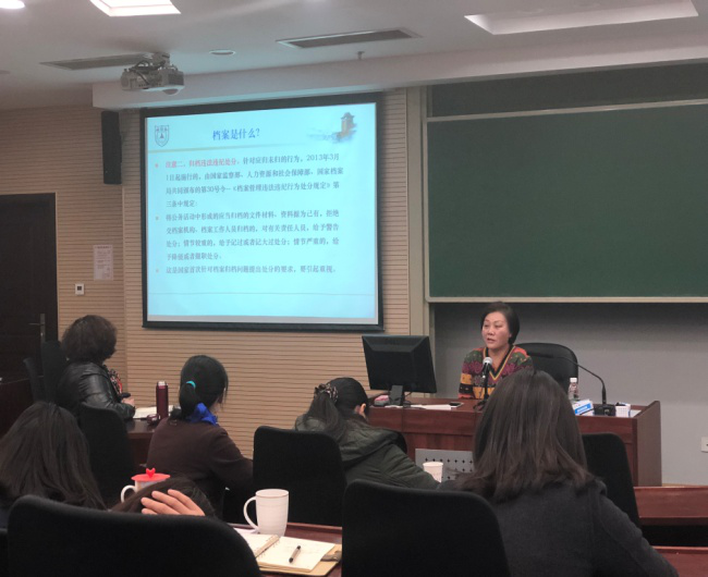科学规范的档案管理,是衡量一个单位管理水平的重要标尺。档案是机关行政管理和业务工作的查考凭据;是科学研究的基础和条件。吴馆长从什么是档案、档案管理的重要性、档案管理的基本原则等方面作了讲解。吴馆长还通过图片向各位老师展示了太阳成集团tyc33455cc档案馆现代化的条件,为提供档案的完善保管起到了积极的保障。在讲课之后,吴馆长以及档案馆的其他老师,就商院老师们关心的问题进行了一一的解答及交流。