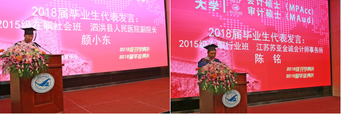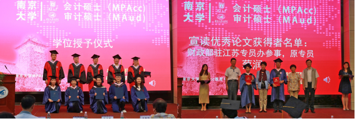 2018届在职社会班毕业生代表颜小东、2018届在职行业班毕业生代表陈铭分别作了饱含热情、感人至深的毕业感言。在颜小东同学发言之际,所有毕业生共赏了2018届毕业纪念片,共同回忆了往日共同求学、相互勉励的激情岁月。毕业生代表发言后,终于迎来了属于2018届毕业生的庄严时刻。研究生院朱易然副经理宣读了“授予2018届员工会计硕士、审计硕士专业学位的决定”。2018届的毕业生们身穿硕士服、依次走上主席台接受学位授予仪式,各位导师们为其颁发学位证书、进行拨穗,表达祝贺之情。会上,财政部驻江苏专员办参事蔡润原专员宣读了“优秀毕业论文获得者”名单,获奖同学接受了表彰。