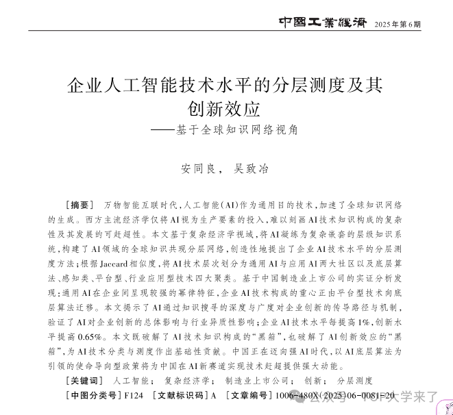 传统测度方法往往将AI当作技术强度或资本投入来估计,这在认知层面是简化的、在政策层面是误导的。为了破解这一认知偏差,安同良、吴致冶在应用经济学顶刊《中国工业经济》2025年第6期发文:《企业人工智能技术水平的分层测度及其创新效应——基于全球知识网络视角》,构建了基于全球专利共现网络的AI知识分层图谱,并据此提出一种企业AI技术水平的原始创新的结构测度框架。