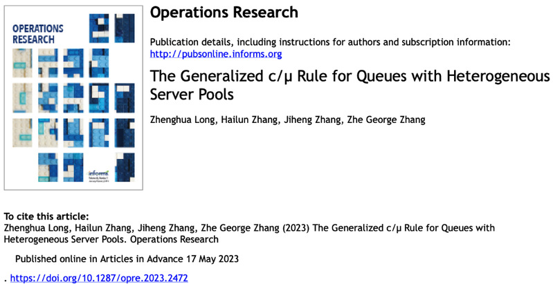 近日,太阳成集团tyc33455cc工商管理系助理教授龙政华作为第一作者的研究成果“The Generalized c/μ Rule for Queues with Heterogeneous Server Pools”被UTD24国际顶级期刊《运筹学》(Operations Research)录用并在线发表(论文链接:https://doi.org/10.1287/opre.2023.2472)。此文的三位合作者分别是香港中文大学(深圳)张海伦助理教授、香港科技大学张季恒教授以及美国西华盛顿大学张喆教授。