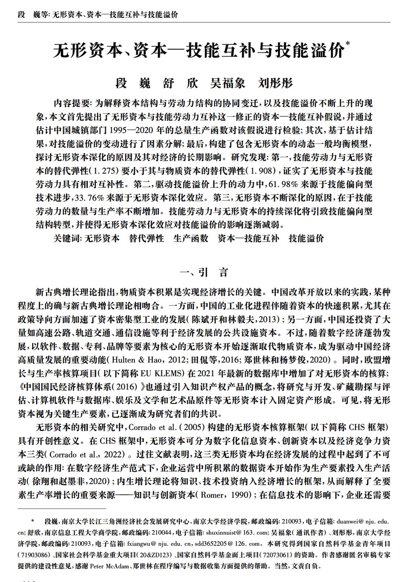 【关键词】无形资本;替代弹性;生产函数;资本—技能互补;技能溢价;