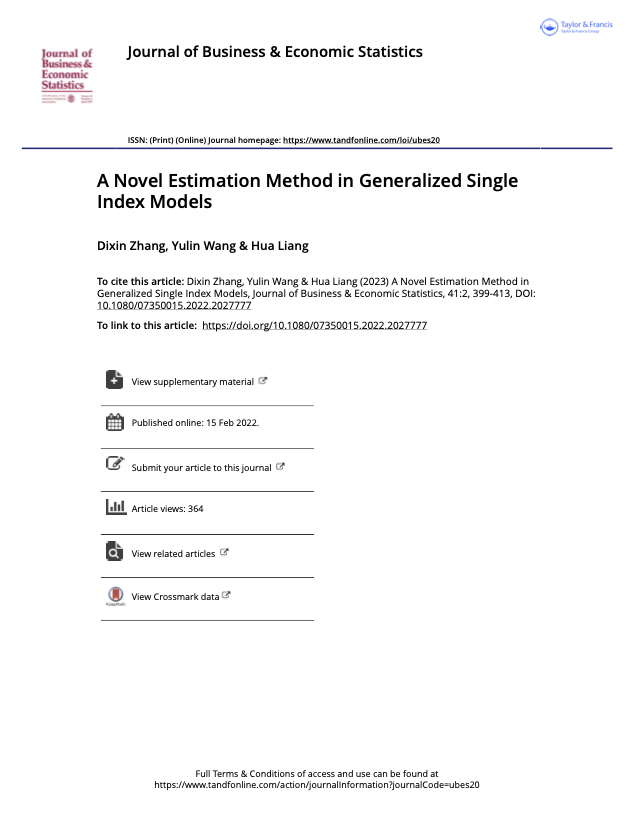 近日公司退休教授张涤新老师在Journal of Business & Economic Statistics发表论文,题目是A Novel Estimation Method in Generalized Single Index Models。Journal of Business & Economic Statistics是数学和统计学国际顶级期刊。张涤新老师退休之后,仍然坚持进行学术研究,继续为团队建设贡献力量,研究探索始终在路上,学术追求永不停步的精神,值得广大科研工作者学习借鉴。