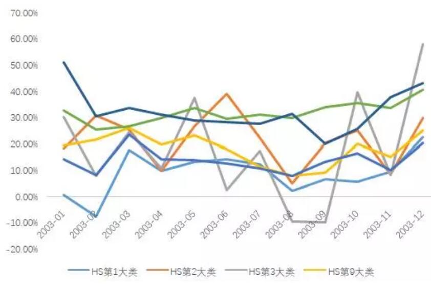 从2003年中国分行业出口变化的数据来看,受SARS疫情影响较大的行业分别是HS第一大类(动物产品),第二大类(植物产品),第三大类(动、植物油、脂及其分解产品)、第九大类(木及木制品)和第十二大类(鞋、帽、伞及其零件),出口增速在某些月份甚至出现负增长,相反,第十六大类(机器、机械器具、电气设备),第十七大类(车辆、航空器、船舶及有关运输设备)等资本和技术密集型产品出口则并没有受到太大影响,基本都能保持25%以上的高速增长势头,也正是依靠这些行业出口的强势带动,保证了疫情后我国出口的强劲复苏。