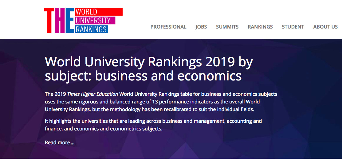 泰晤士高等教育世界大学专业排名(Times Higher Education World University Ranking by subject),是由英国泰晤士高等教育(Times Higher Education,简称THE)发布。该排名每年更新一次,以教学、研究、论文引用、国际化程度、产业收入5个范畴共计13个指标作为评判标准。重点衡量在商业和管理(Business and Management),会计和金融(Accounting and Finance),经济学和计量经济学(Economics and Econometrics)学科领先的大学。今年的商业和经济专业排名囊括了全球585所一流大学。