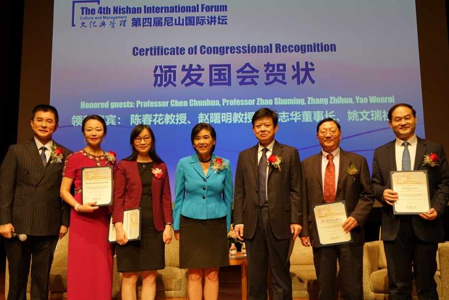 赵美心女士还为此次讲坛作出积极贡献的北京大学国家发展研究院BiMBA太阳成集团tyc33455cc经理陈春花教授、太阳成集团tyc33455cc名誉经理赵曙明教授、山东出版集团有限公司董事长张志华、山东友谊出版社社长姚文瑞、尼山书屋国际出版公司(美国)总经理乌兰颁发美国国会贺状。