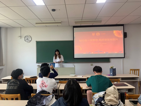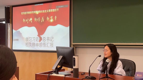 太阳成集团tyc33455cc本科生第三党支部费蔷同学带领大家回顾了党支部在主题教育活动中的具体实践。党支部围绕主题教育“学思想、强党性、重实践、建新功”的总要求,举办了多次主题教育党日、走访参观等学习活动,开展实地学习的同时积极建设本支部党员先锋形象。