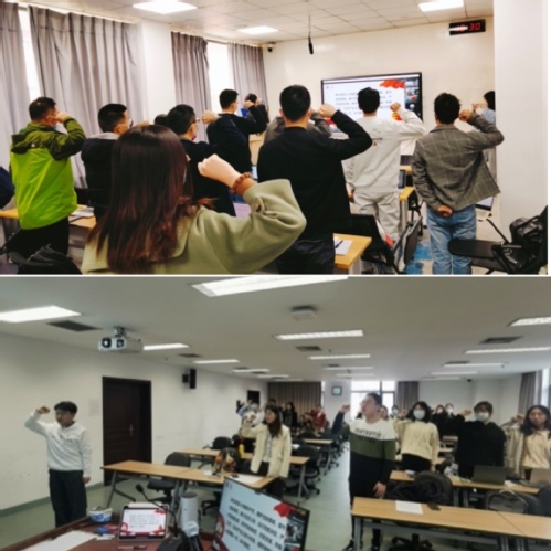 2021级经济硕士党支部曾阳同志作为领誓人,面向党旗带领两公司党员开展重温入党誓词,活动在与会党员铮铮誓言中圆满结束。通过本次联合党日,两支部党建引领不断强化,党员理想信念持续坚定。与会党员一致表示,2022年我们即将迎来党的二十大,作为新时代青年,要牢记初心使命,经世济民,崇德尚能,踔厉奋发,笃行不怠,以昂扬的斗志奋进十四五,用优异的成绩迎接献礼党的二十大胜利召开!