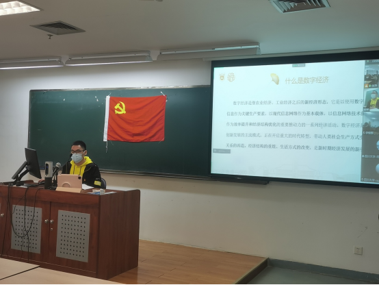 2021级经济硕士党支部李子睿同志以“笃行致远,惟实励新”为主题,带领与会成员学习了习近平总书记在《求是》杂志上的文章《不断做强做优做大我国数字经济》。他围绕数字经济的定义、内涵和特征等问题,通过国际比较,结合具体数据向与会成员讲解了数字经济的理论基础、发展现状和重大意义,明确了我国发展数字经济面临的新形势、新问题,同时针对近年来数字经济相关政策开展梳理并进行解读。他认为,发展数字经济有利于推动构建新发展格局,有利于推动建设现代化经济体系,有利于推动构筑国家竞争新优势。