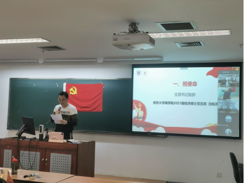 2021级经济硕士党支部书记刘铭丞同志介绍了本次党日的筹备情况,并围绕党支部建设等方面作交流分享。他表示,支部工作要坚持以党的指导思想,特别是习近平新时代中国特色社会主义思想为根本理论指导,不断巩固深化主题教育成果,团结带领支部党员不断增强“四个意识”、坚定“四个自信”、做到“两个维护”,把握“两个确立”,下一步支部将继续探索党建工作与专业学习有机结合,围绕中心、服务大局,立足主责主业,经世济民,崇德尚能,把论文写在祖国大地上。