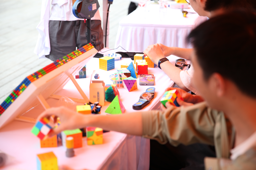 音乐过后游戏继续!魔方社的摊位上,异形魔方挑战巫师们的空间想象力,魔方速盲复原则考验着巫师们的记忆与手速。