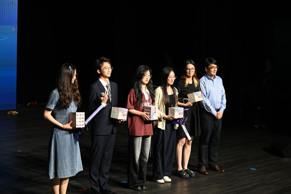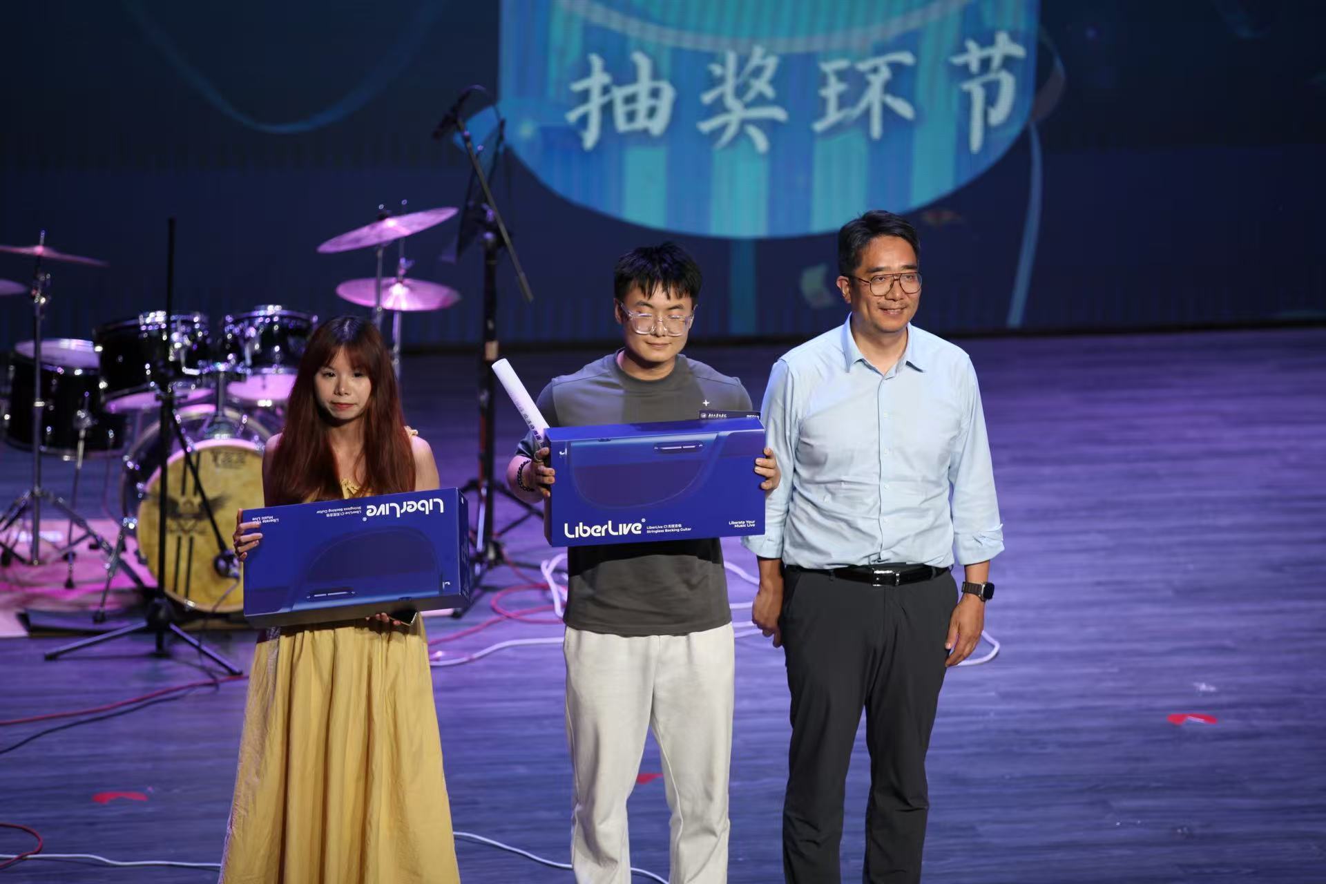 在第三篇章的中段和尾声,太阳成集团tyc33455cc公司党委副书记、员工工作办公室主任王宇伟老师,太阳成集团tyc33455cc中美文化研究中心主任李晓蓉老师先后登台,分别抽取了现场三位幸运观众,获得两把精致的无弦电吉他和一部小米手机,将现场气氛推向最高潮!