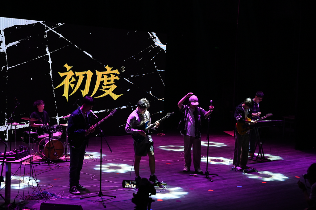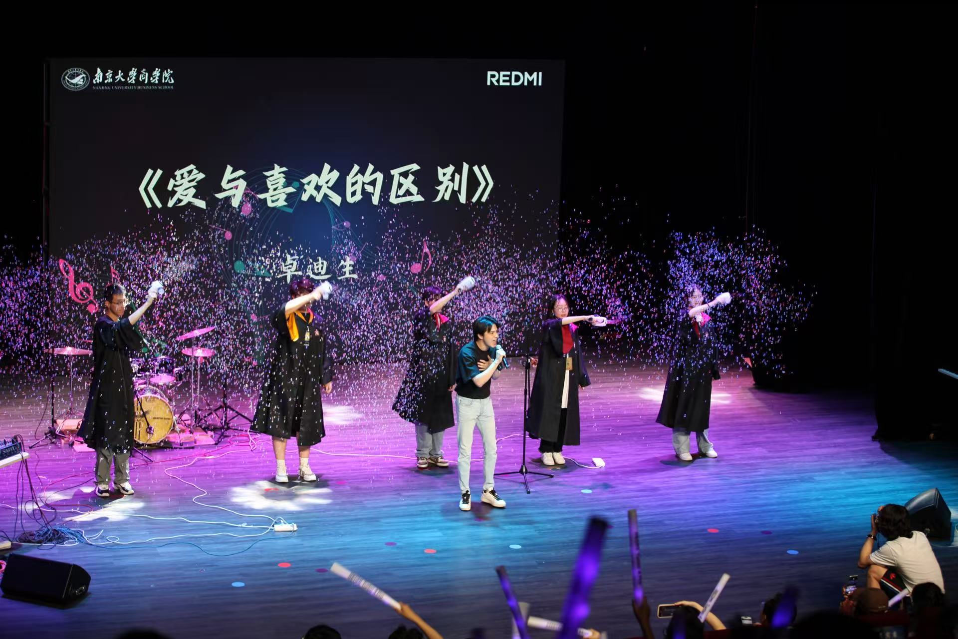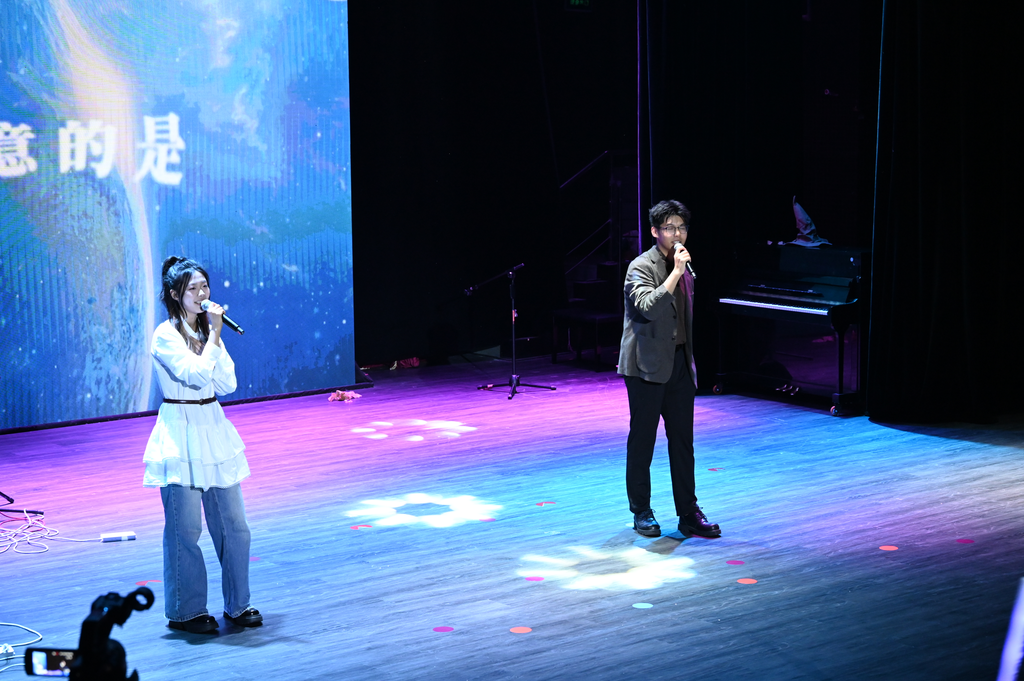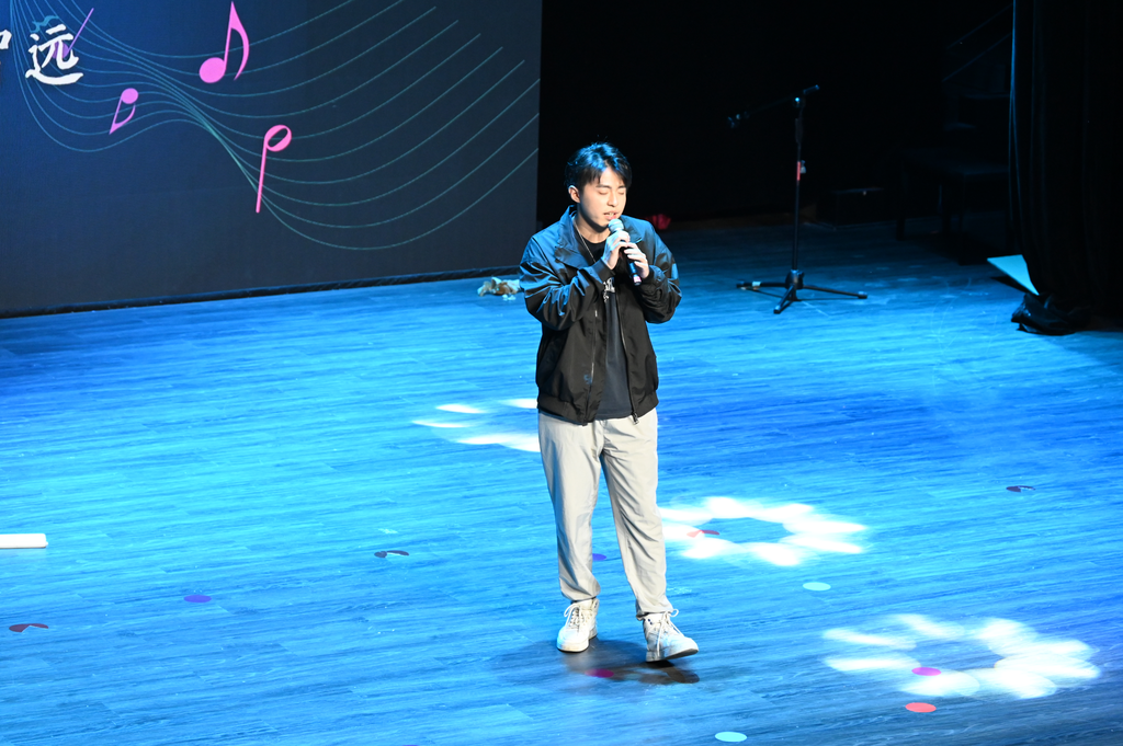 接下来,初度乐队登场!《夏日漱石》《Dosed》《加州旅馆》三首作品接连上演,澎湃的节奏与抒情的旋律交织,瞬间点燃全场热情。随后卓迪生老师带来一首《爱与喜欢的区别》,他用细腻的嗓音诠释情感中的微妙差异,旋律舒缓却直击人心。吴怡菲、周天合作的《Memory》使经典旋律在柔和的声线中流淌,营造出静谧深情的舞台效果。紧接着,特邀嘉宾安徽大学庄甡杰演唱一首《烟火里的尘埃》,以极具感染力的演绎,将歌曲中的孤独与倔强娓娓道来,引发观众共鸣。最后,晚会在全场齐唱《夜空中最亮的星》中落幕,荧光棒随歌声摇曳,温暖而澎湃的合唱为整场演出留下感动的余韵。