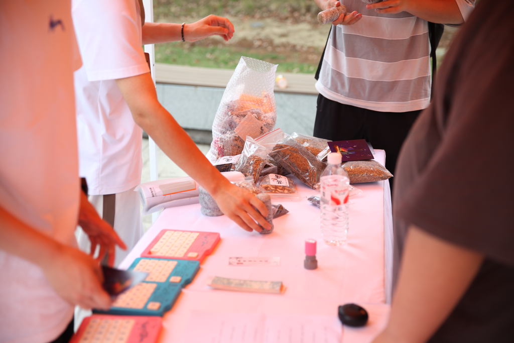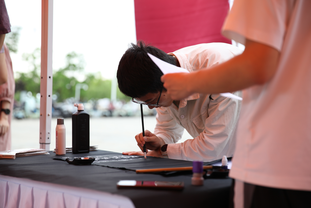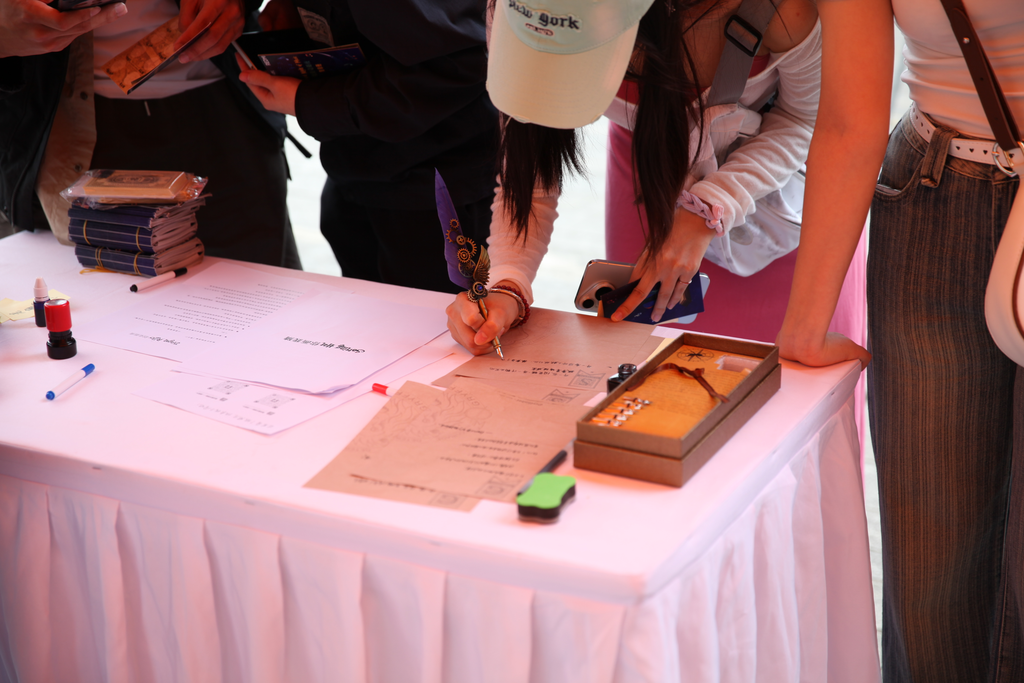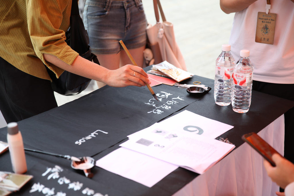 知恬书画社的摊位前,同学们挥毫泼墨,通过“魔咒考核”和狮、鹰、蛇、獾四院吉祥物绘画留下有趣且独一无二的魔法书签纪念。