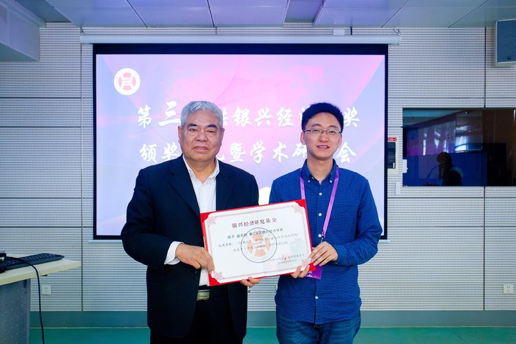 洪银兴教授为第三届洪银兴经济学奖获得者席鹏辉博士颁奖