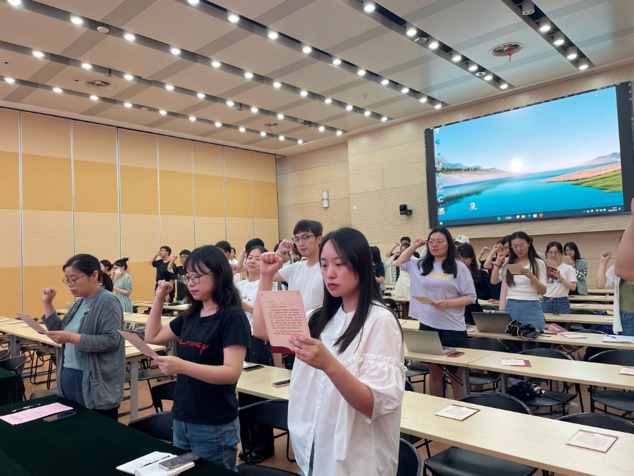 大会最后,2020级国贸硕士党支部书记余嘉莉带领全体党员重温入党誓词,坚定的宣誓声回荡在鸿意报告厅。2023届毕业生党员主题教育大会至此圆满结束。