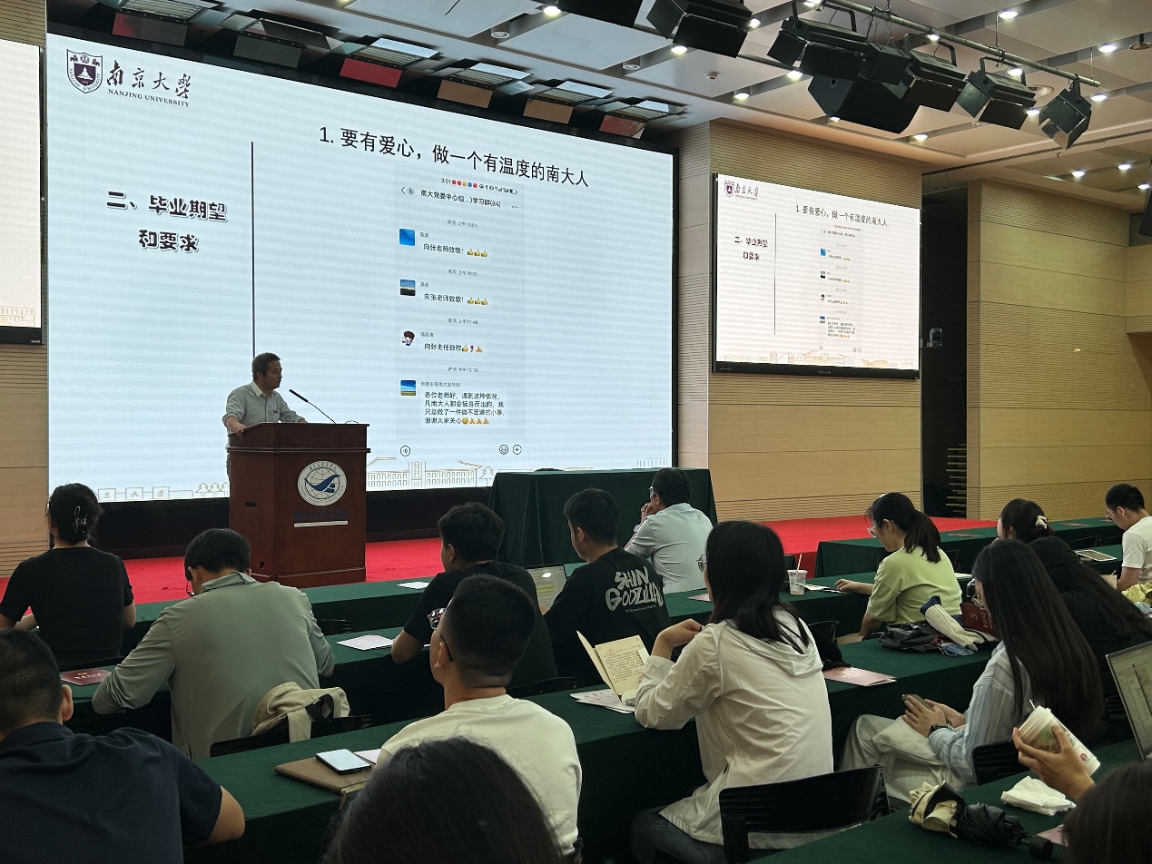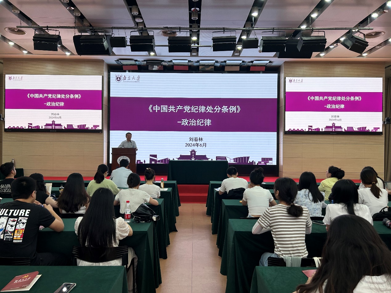 刘春林结合《中国共产党纪律处分条例》的修订背景,围绕《条例》中的“六大纪律”讲授主题党课。刘春林指出,政治纪律是党的“第一纪律”,所有党员要把严明政治纪律和政治规矩摆在首位,在重大原则问题上与党中央保持高度一致,坚定拥护“两个确立”,坚决做到“两个维护”。针对员工党员特点,刘春林结合生动案例,带领大家破解关于“言论自由”、“自由贸易”等若干认识误区。最后,他勉励全体毕业生做有爱心、有温度的南大人,在今后的工作学习中持续学习,应对环境变迁,以南大人特有的社会责任感和使命感投身今后的工作和学习,在新的岗位继续发挥党员先锋模范作用。