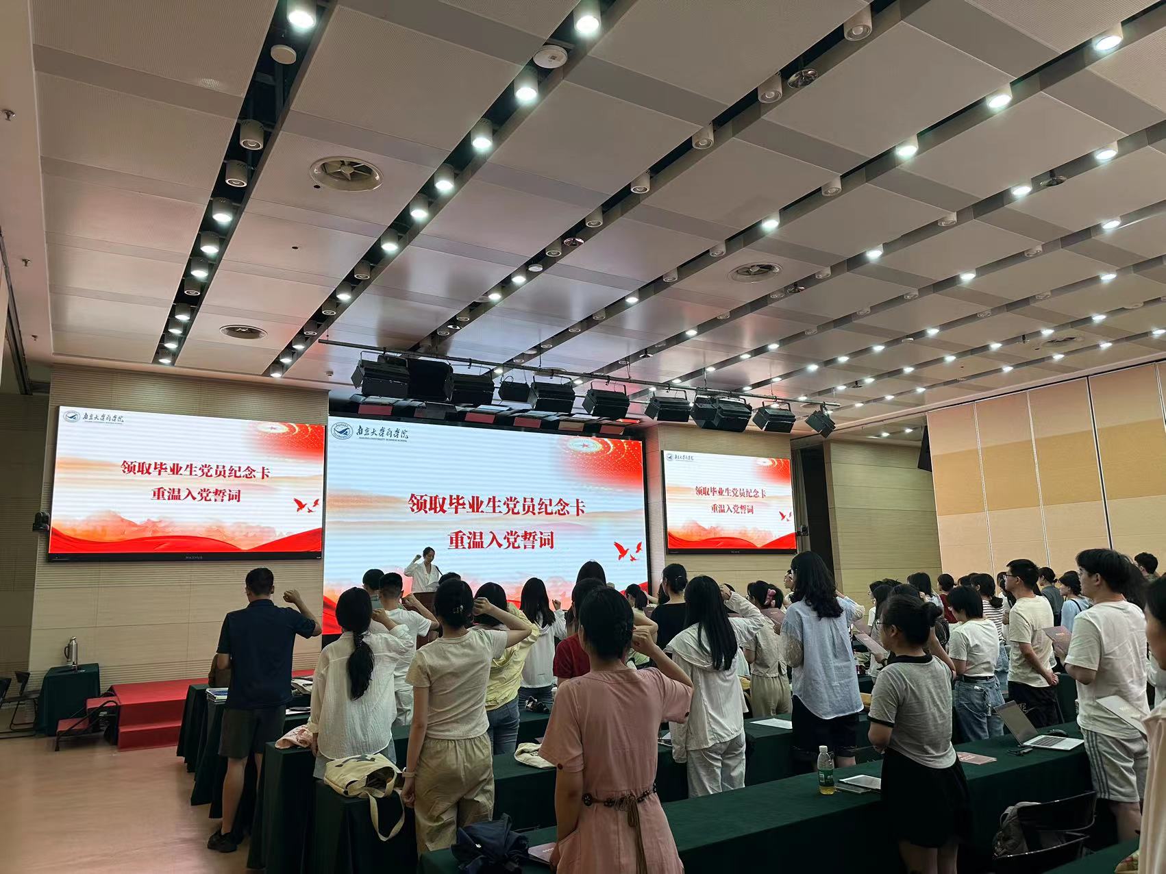 大会最后,2021级企管硕士党支部书记熊媛媛带领全体党员重温入党誓词,坚定的宣誓声回荡在鸿意报告厅。2024届毕业生党员主题教育大会至此圆满结束。