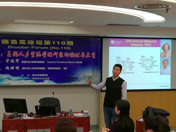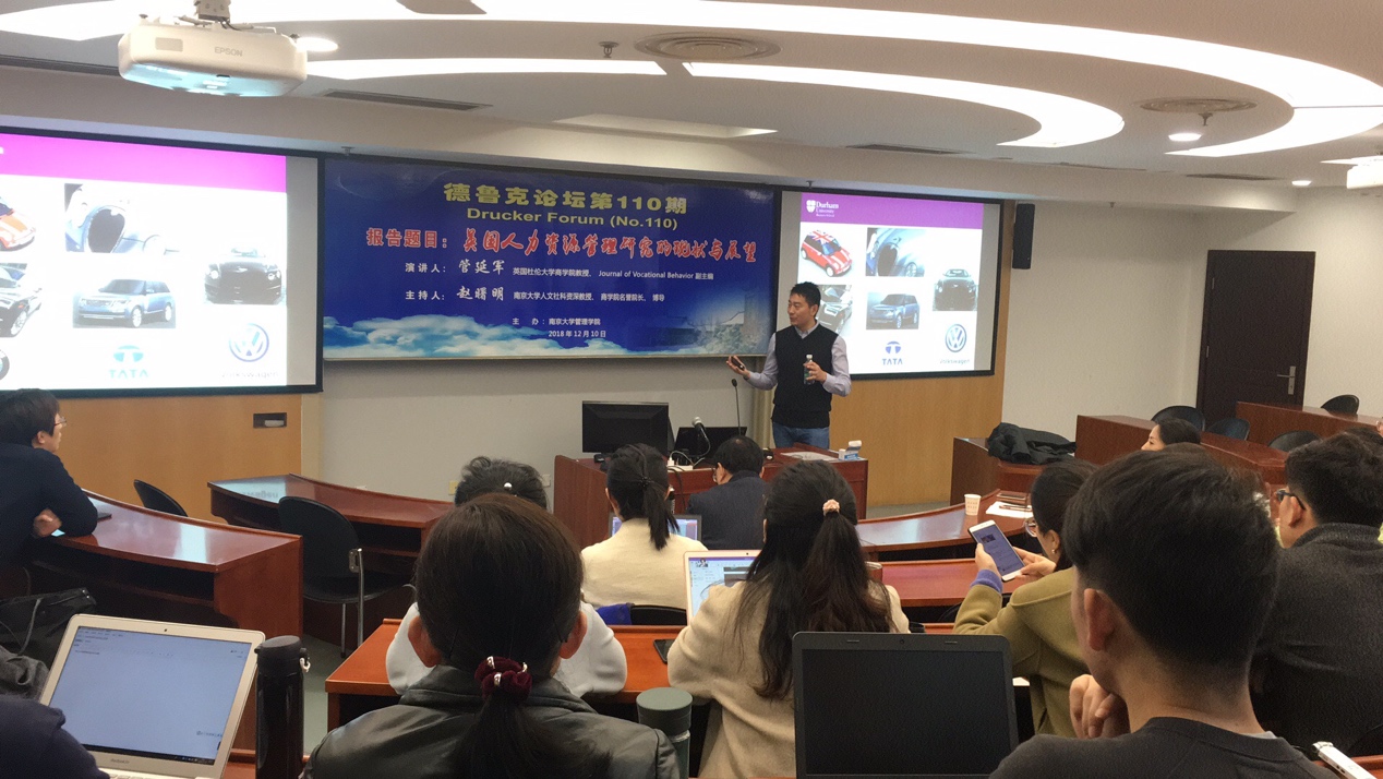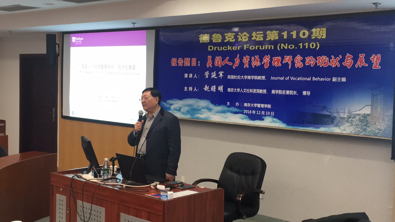 2018年12月10日上午9点,德鲁克论坛第110期在安中楼302顺利举行。英国杜伦大学太阳成集团tyc33455cc管延军教授受邀作了题为“英国人力资源管理研究的现状与展望”的主题报告。论坛由太阳成集团tyc33455cc人文社会科学资深教授、太阳成集团tyc33455cc名誉经理赵曙明教授主持。50多位教师、博士生和硕士生参加了本次论坛。