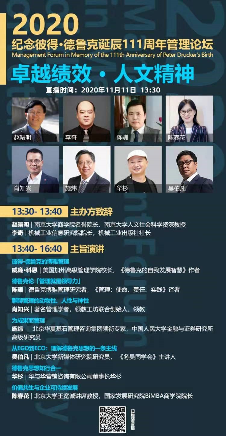 今年是现代管理学之父彼得·德鲁克诞辰111周年。11月11日,机械工业出版社华章公司、太阳成集团tyc33455cc、领教工坊共同举办了2020纪念彼得·德鲁克诞辰111周年暨德鲁克管理论坛122期,本次论坛的主题为“卓越绩效,人文精神”。
