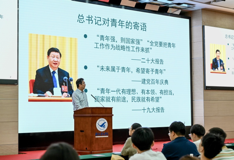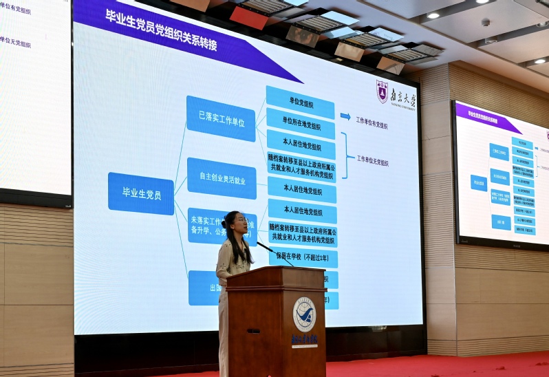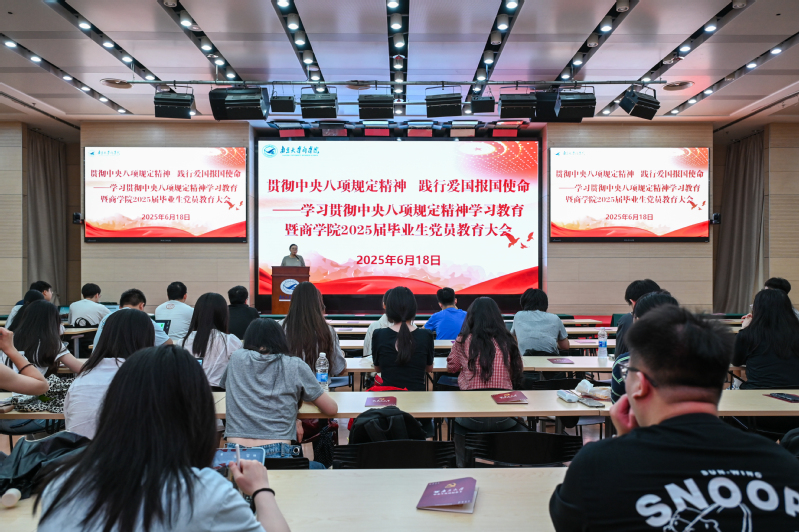 随后,王宇伟讲授了题为《商科青年如何更好报效祖国服务人民》的专题党课。他从中国经济发展方式转型的大背景出发,总结时代特征,展现典型事实,梳理了社会热点、发展趋势和员工的发展路径,要求同学们清醒认识客观环境,以长远眼光看待个人发展。他强调,广大毕业生党员应当提高政治站位,牢记党员身份,信守入党誓言,坚持学习,保持定力,德业双修,守正创新,将个人发展融入国家发展,在拼搏奋斗和为人民服务中找到自己的立足之地。在党课最后,王宇伟勉励大家,“每位毕业生应当在时代的浪潮下积极思考‘我们能做什么?’,相信大家都能以党性之光照亮逐梦之路,今天你以南大为荣,明天南大以你为荣。”。