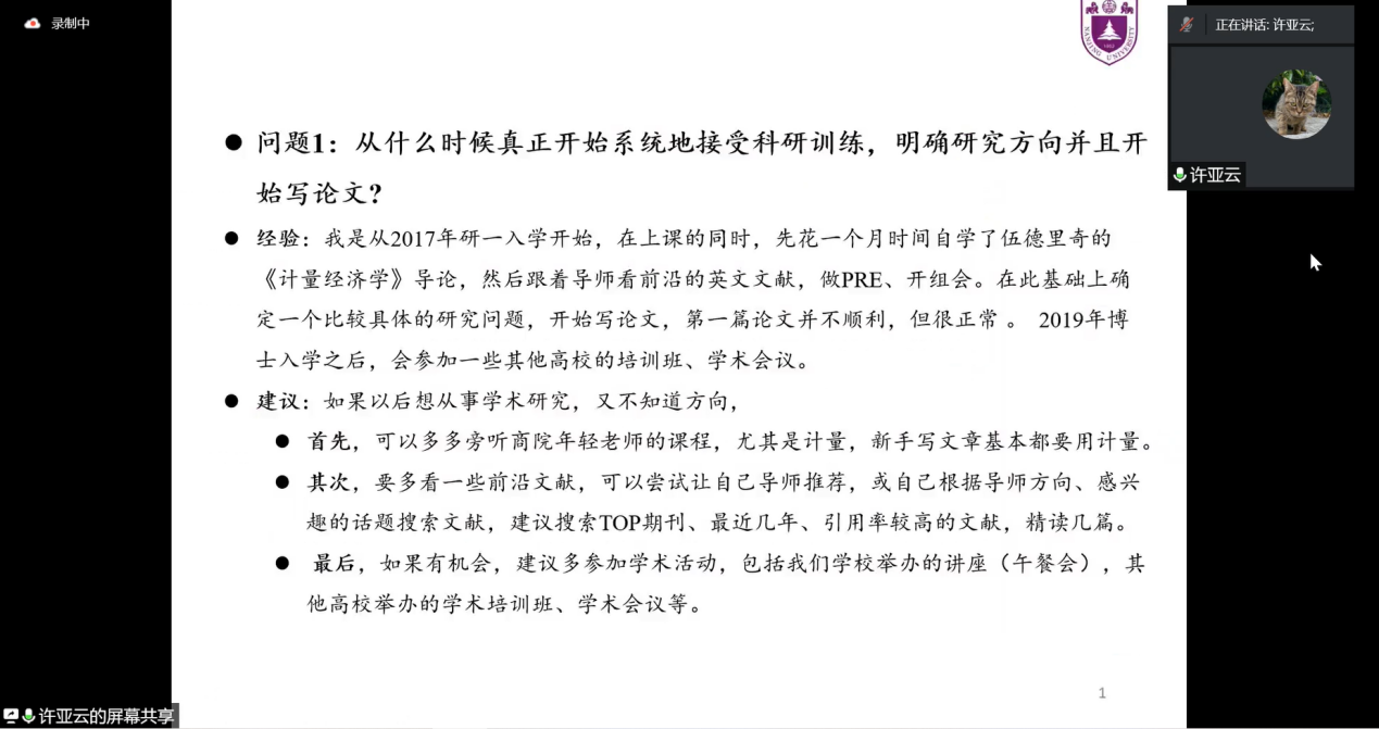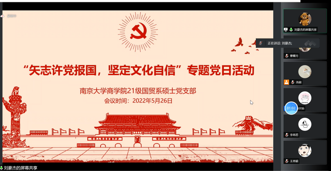 2022年5月26日,为深入学习总书记重要回信精神,同时解决大家关于学术写作的困惑,21级国贸系硕士党支部于线上召开“矢志许党报国,坚定文化自信”主题党日活动,此次活动由支部成员刘豪杰同志主持,会议邀请到2021年度国家奖学金获得者、国际贸易学专业博士研究生许亚云学姐,分享她在学术科研上的经验心得。
